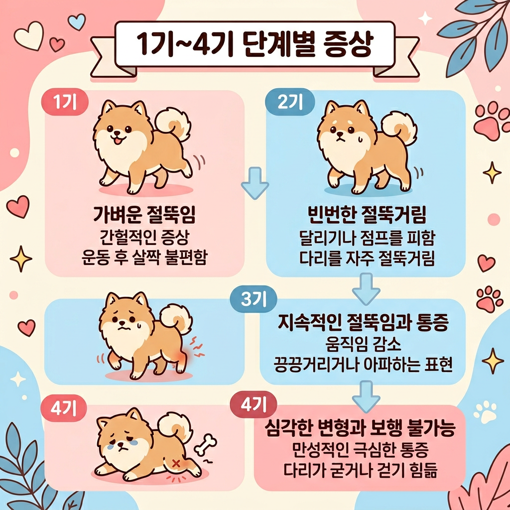 슬개골 탈구는 1기~4기로 나눠지는데, 각 단계마다 증상과 치료 방향이 완전히 달라져요. 단계가 올라갈수록 통증이 심해지고, 결국 수술 없이는 정상적인 보행이 불가능해진답니다.