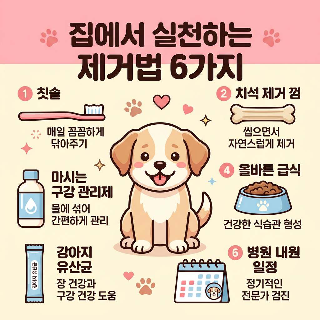 ① 매일 양치질 → ② 덴탈껌(보조) → ③ 음용수 첨가제 병행 → ④ 건식 사료 위주 식단 → ⑤ 구강 유산균 꾸준히 급여 → ⑥ 6개월~1년마다 스케일링. 이 6단계를 꾸준히 실천하면 3개월 안에 눈에 띄는 변화를 느낄 수 있어요!