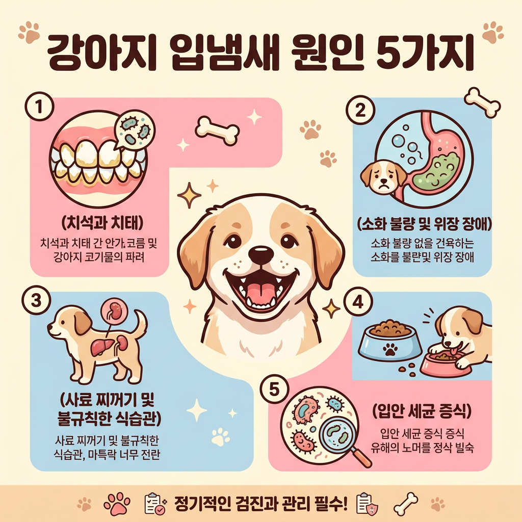 입냄새의 원인을 정확히 알아야 올바른 해결책을 찾을 수 있어요. 무턱대고 구강청결제만 뿌렸다가 근본 원인을 놓치는 경우가 정말 많거든요. 아래 5가지 원인을 차근차근 살펴보시고, 우리 강아지에게 해당되는 원인이 뭔지 파악해 보세요.