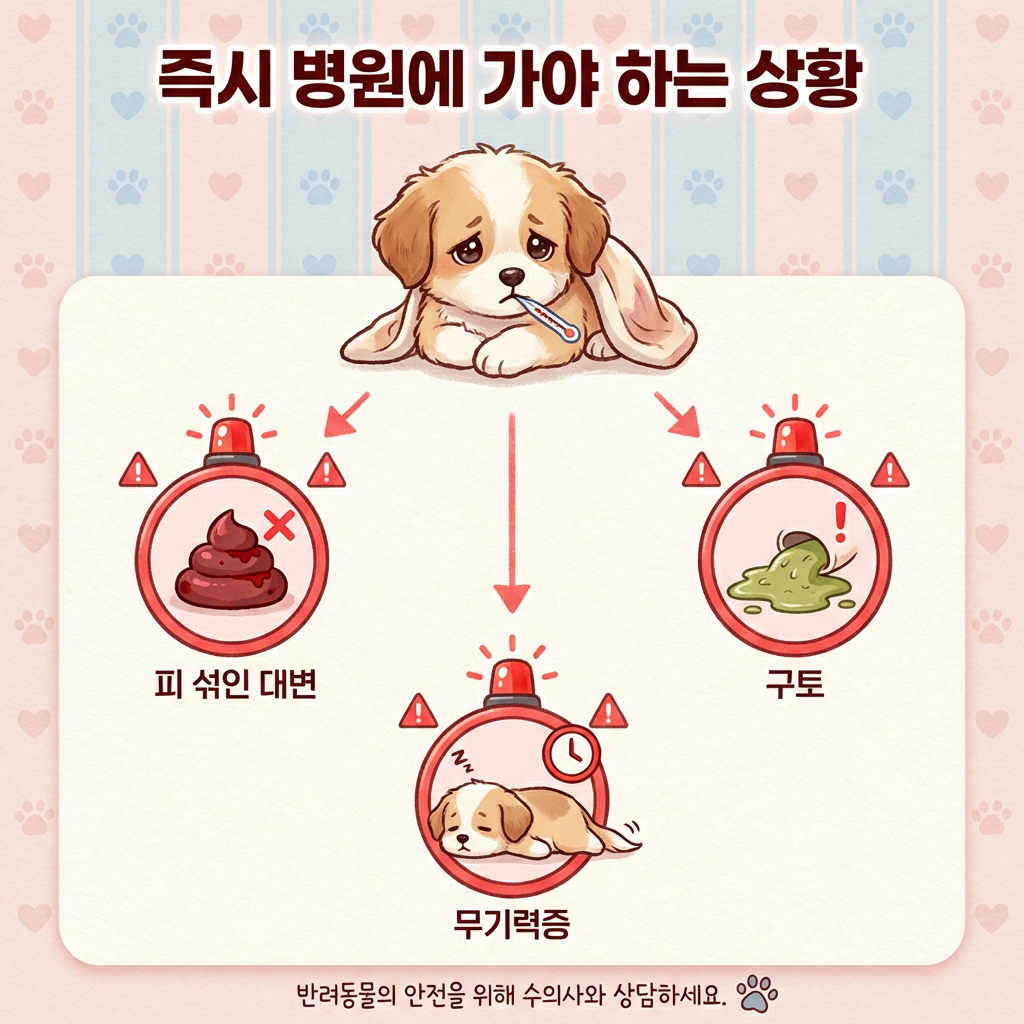 즉시 병원에 가야 하는 상황: 설사에 선홍색 혈액이나 흑색 점액이 섞여 나오는 경우, 구토와 설사가 동시에 나타나는 경우, 24시간 이상 물 같은 설사가 지속되는 경우, 강아지가 축 처지고 일어서기를 힘들어하는 경우, 배를 바닥에 대거나 웅크려 복통을 호소하는 경우, 하루에 5회 이상 설사하는 경우, 새 사료 급여 후 얼굴·눈꺼풀·입 주변이 붓는 경우(알레르기 쇼크 가능성)가 해당돼요.