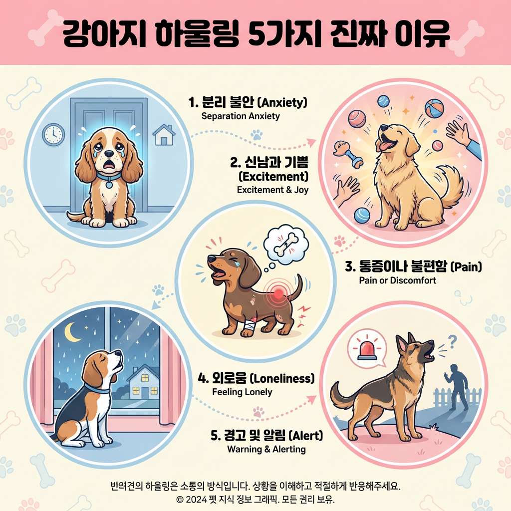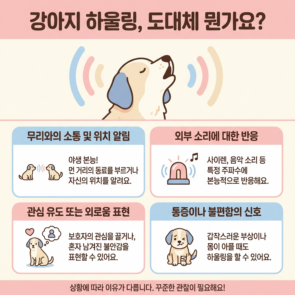 A. 강아지가 하울링을 하는 이유는 분리불안, 특정 소리에 대한 본능적 반응, 관심 끌기, 통증 표현, 무리 소집 본능 등 다양해요. 상황과 시간대를 함께 관찰하면 어떤 유형인지 파악하기 쉬워요.