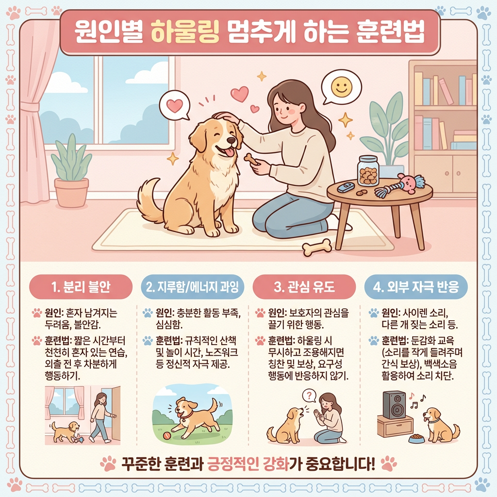 하울링 훈련의 핵심은 소리를 막는 게 아니라 강아지의 감정 상태를 바꿔주는 거예요. 원인에 따라 접근법이 완전히 달라지기 때문에, 유형을 먼저 파악한 뒤 아래 해당 훈련법을 적용해보세요.