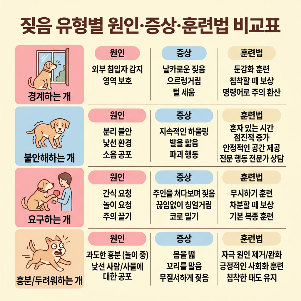 📊 짖음 유형별 원인·증상·훈련법 비교표
