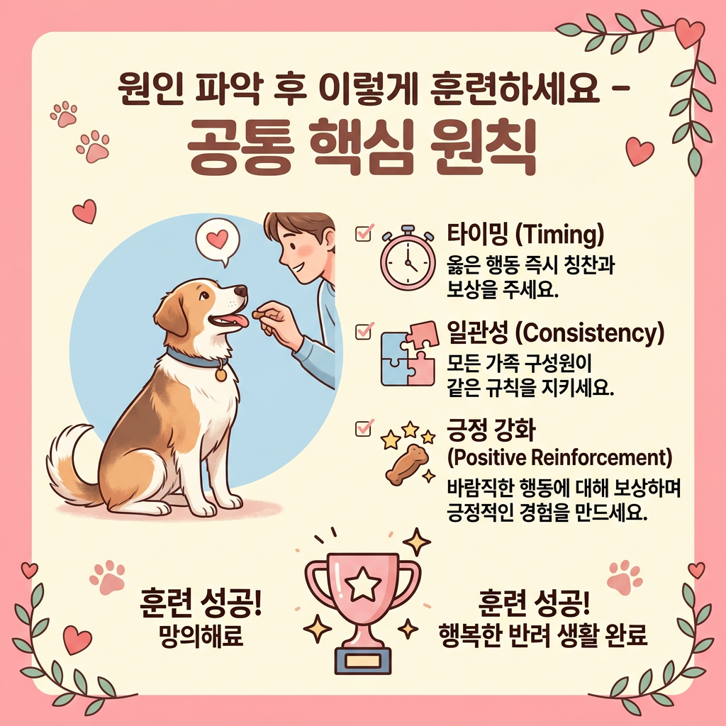 유형이 달라도 모든 짖음 훈련에는 공통적으로 적용되는 핵심 원칙이 있어요. 이것만 지켜도 어떤 유형이든 훈련 효과가 훨씬 빠르게 나타납니다.