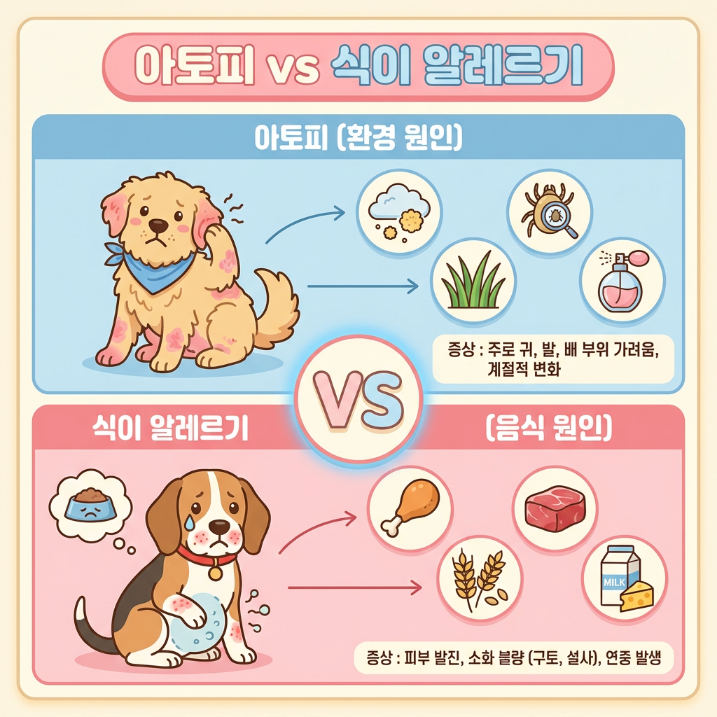 강아지 보호자들이 가장 많이 혼동하는 부분이 바로 아토피 피부염과 식이 알레르기예요. 증상이 비슷하게 보이지만, 원인과 관리 방향이 완전히 달라서 정확히 구분하는 것이 매우 중요해요.