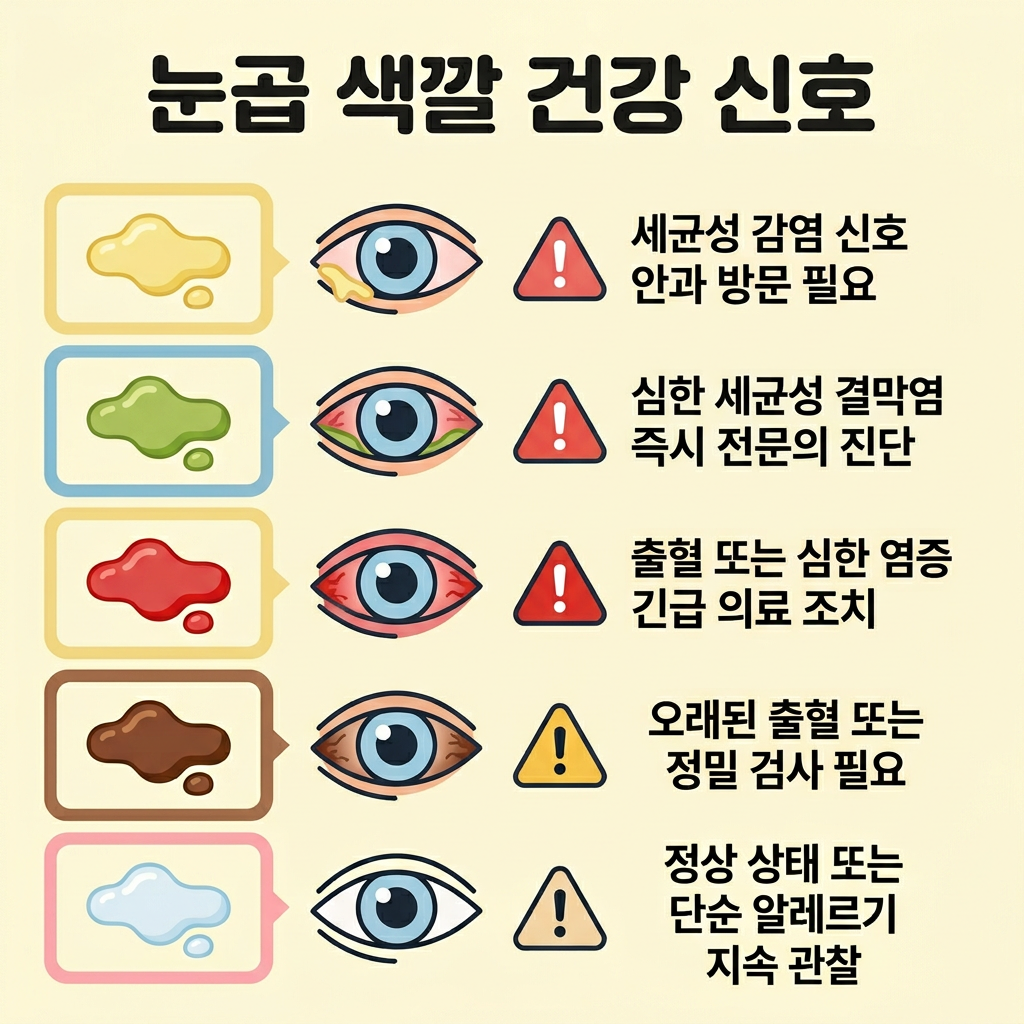 🟡 노란색 눈곱은 세균 감염이나 결막염의 대표적인 신호예요. 고름이 섞여 있는 경우가 많고, 눈꺼풀이 붙어서 눈을 잘 못 뜨는 증상이 함께 나타나기도 해요. 반드시 항생제 계열 처방이 필요한 경우가 많아서 자가 치료는 위험해요.