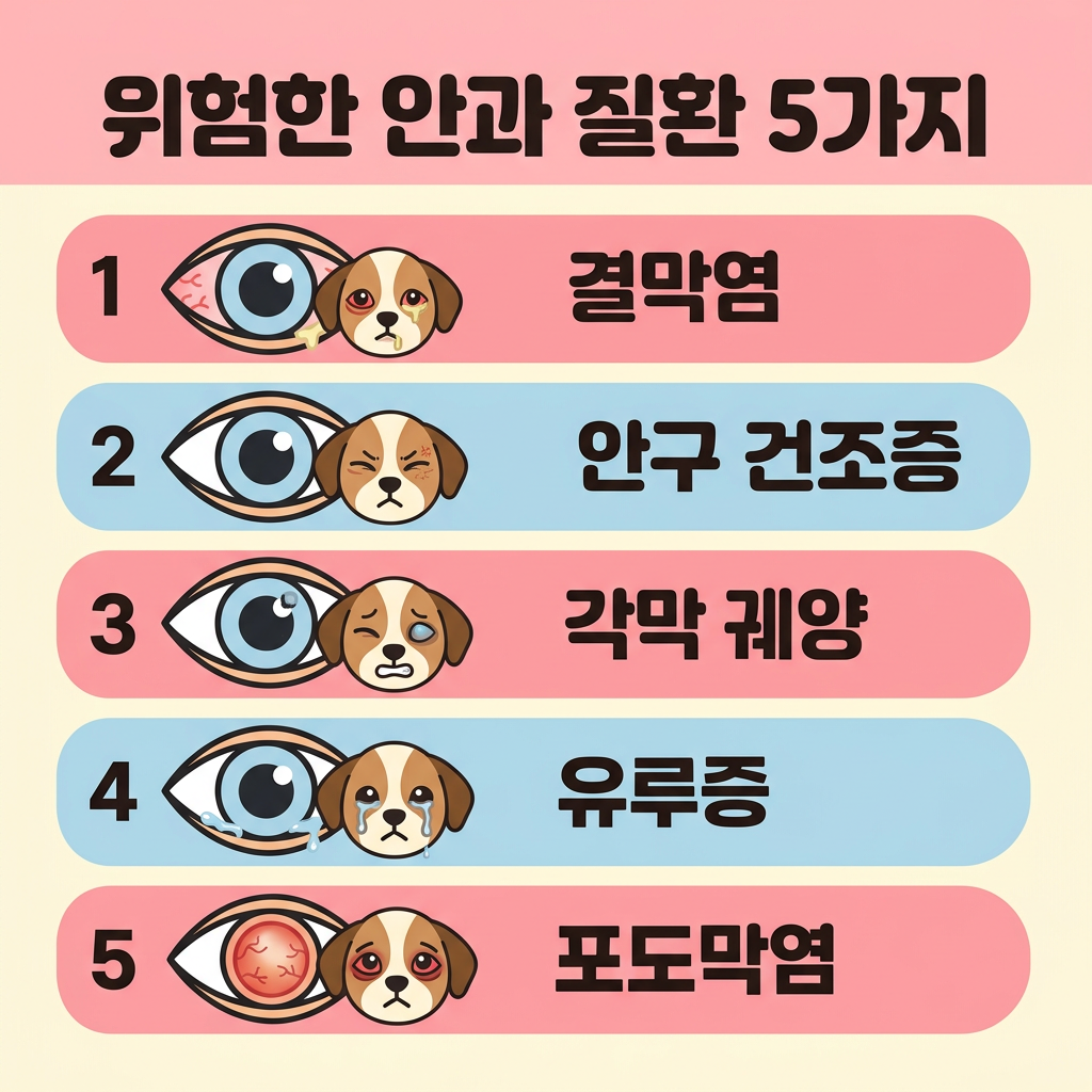 눈곱이 갑자기 많아졌을 때 단순 생리 현상으로 넘기면 안 되는 이유는, 뒤에 숨어 있는 안과 질환들이 생각보다 훨씬 심각할 수 있기 때문이에요. 수의사들이 가장 많이 마주치는 5가지 질환을 정리해 드릴게요.