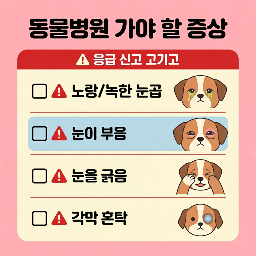 눈곱 색깔이 노란색·초록색·붉은색으로 변했을 때, 눈곱 양이 평소보다 2배 이상 많아졌을 때, 강아지가 앞발로 눈을 자주 비비거나 바닥에 눈을 문지를 때, 눈꺼풀이 붓거나 눈 흰자가 빨갛게 충혈됐을 때, 한쪽 눈만 이상 증상이 나타날 때, 눈이 뿌옇거나 혼탁해 보일 때, 눈을 잘 못 뜨고 계속 찡그리고 있을 때, 눈 주변에서 불쾌한 냄새가 날 때가 즉시 방문해야 하는 경우예요.