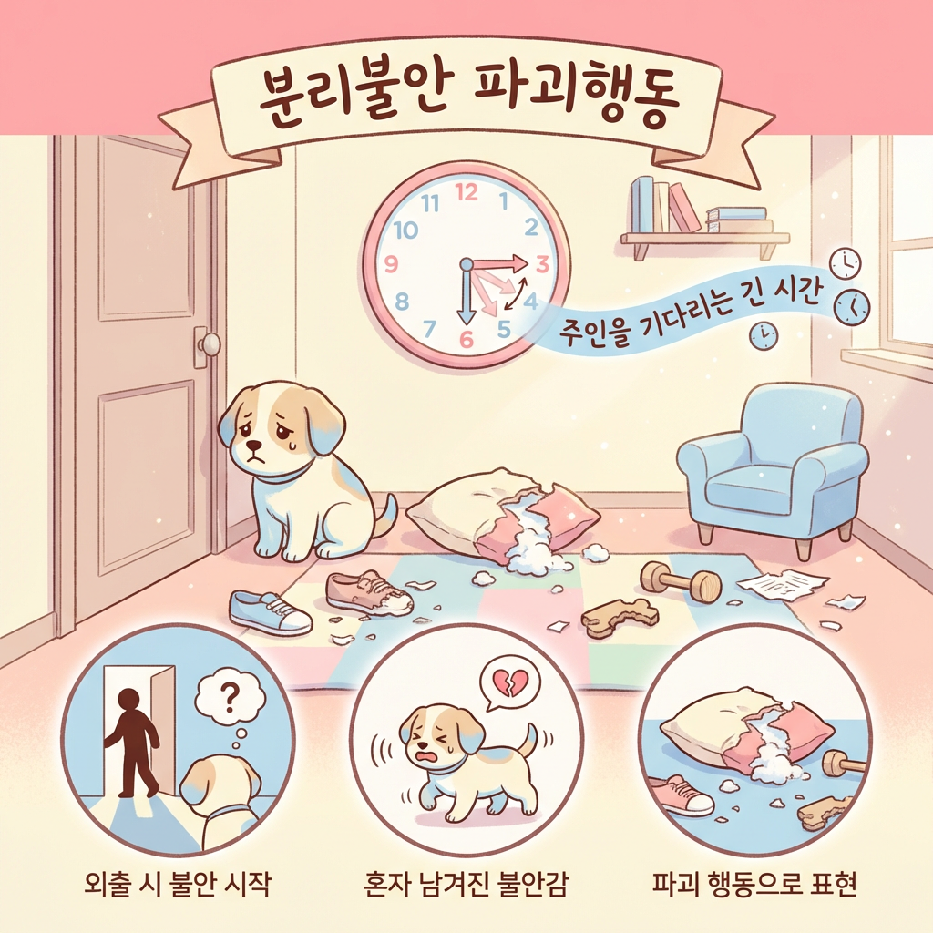 분리불안형 파괴 행동의 특징은 보호자가 외출한 직후 20~30분 이내에 집중 발생하고, 보호자의 냄새가 강하게 남은 물건(슬리퍼, 양말, 옷 등)을 우선적으로 선택한다는 점이에요. 이는 강아지가 보호자의 냄새를 통해 안정감을 얻으려는 심리 때문이에요. 짖음, 하울링, 배변 실수, 과도한 침 흘림이 파괴 행동과 함께 나타난다면 분리불안을 강하게 의심해야 해요.