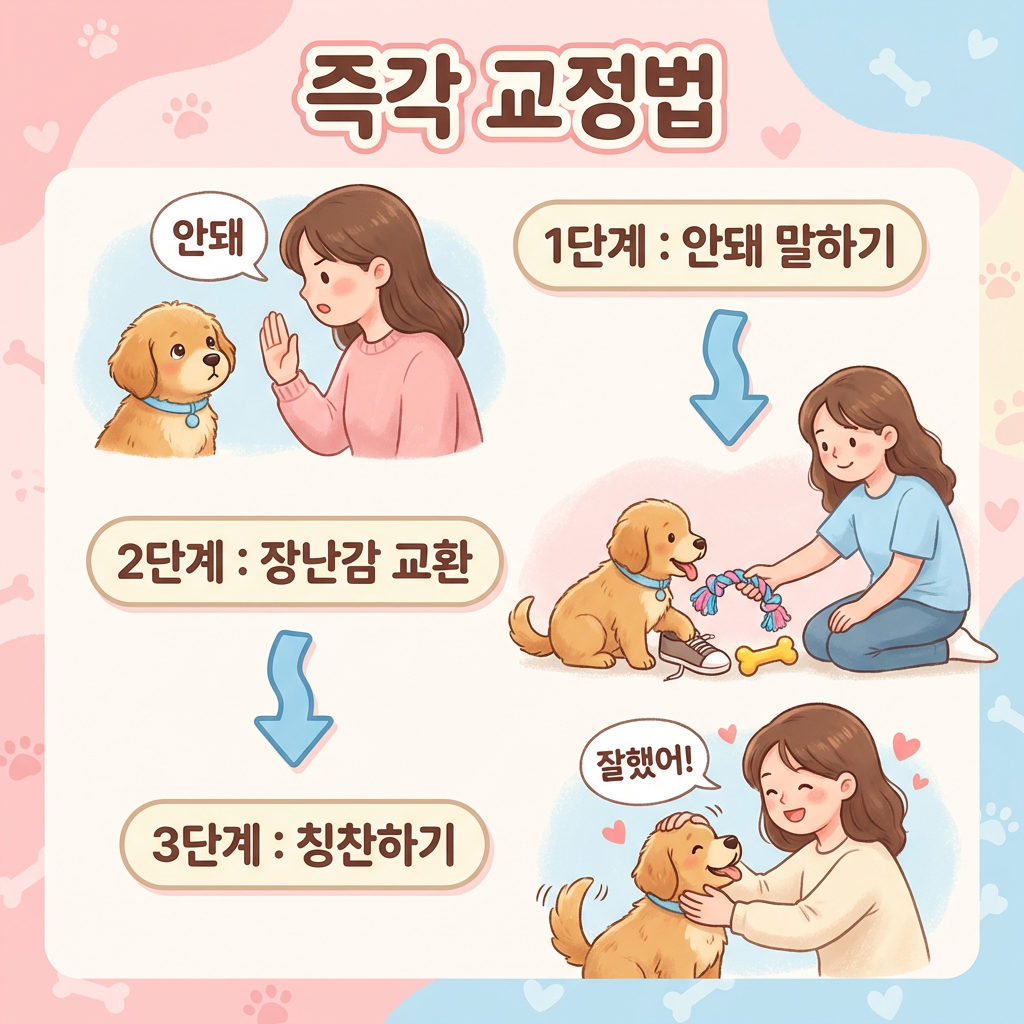 올바른 즉각 교정법은 "안 돼"라는 단호하고 낮은 톤의 한 마디로 행동을 잠시 멈추게 한 뒤, 즉시 물어도 되는 장난감이나 개껌으로 교환해주고, 장난감을 무는 순간 바로 칭찬하는 흐름이에요. 이 '교환+칭찬' 패턴을 꾸준히 반복하면 강아지는 자연스럽게 "장난감을 물면 칭찬받는다"는 것을 학습해요.