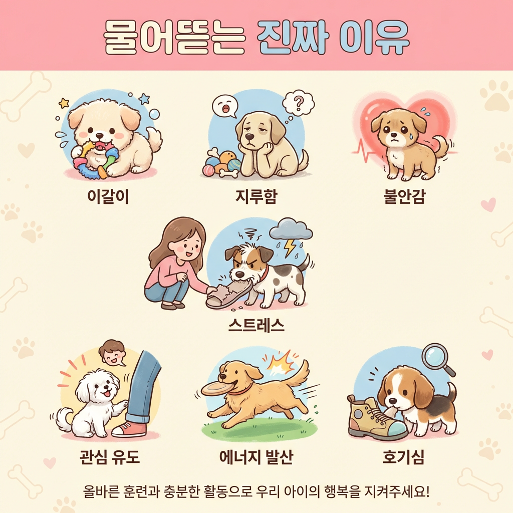 물어뜯기 교정에서 가장 먼저 해야 할 일은 원인 파악이에요. 이유가 다르면 해결책도 완전히 달라지거든요. 같은 '물어뜯기'라도 이갈이 중인 강아지와 분리불안을 가진 강아지는 전혀 다른 접근이 필요해요.