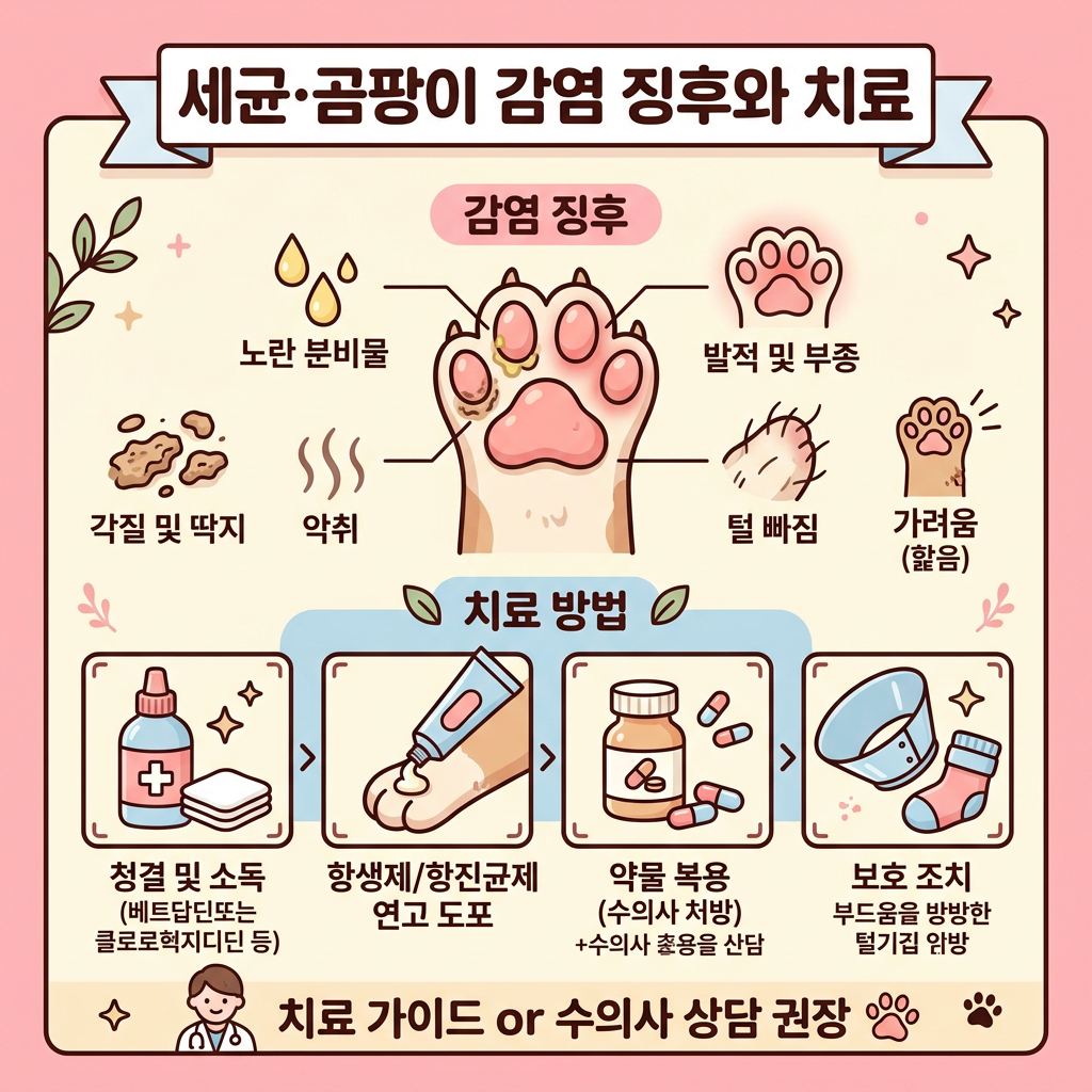 강아지 발바닥에는 슈도모나스균, 포도상구균 같은 세균과 말라세지아 같은 곰팡이균이 자연적으로 존재해요. 대부분은 큰 문제 없이 공존하지만 면역력이 떨어지거나 발이 축축하게 유지되는 환경이 계속되면 이 균들이 과번식하면서 염증을 일으켜요.