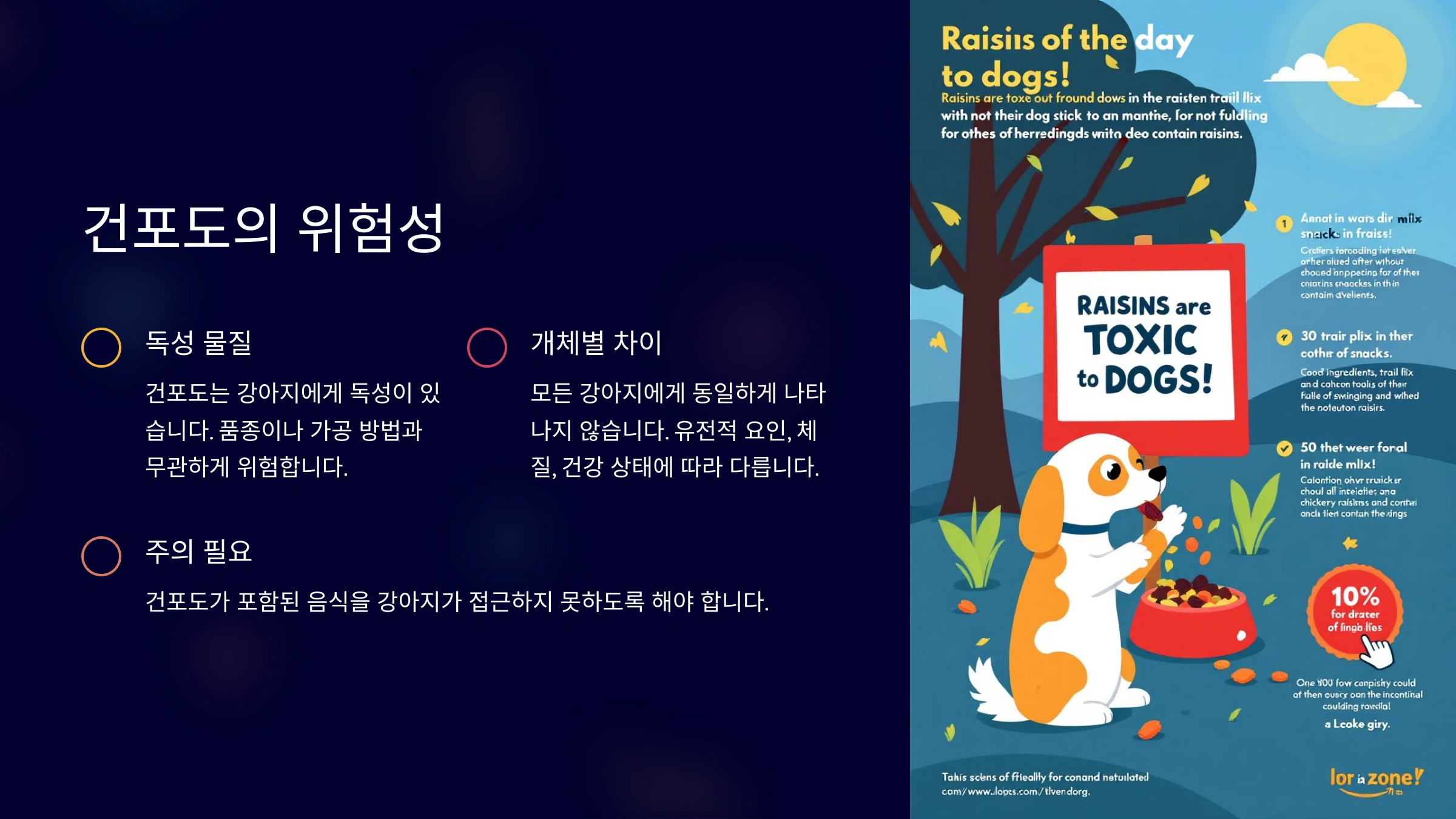 건포도는 강아지에게 독성이 있을 수 있는 음식이에요. 소량의 건포도라도 일부 강아지에게는 치명적인 영향을 미칠 수 있어요. 포도와 건포도의 독성은 품종이나 가공 방법과는 무관하게 나타난다고 해요. 특히 건포도는 농축된 형태의 포도라, 독성 물질이 더 강하게 작용할 가능성이 있답니다.