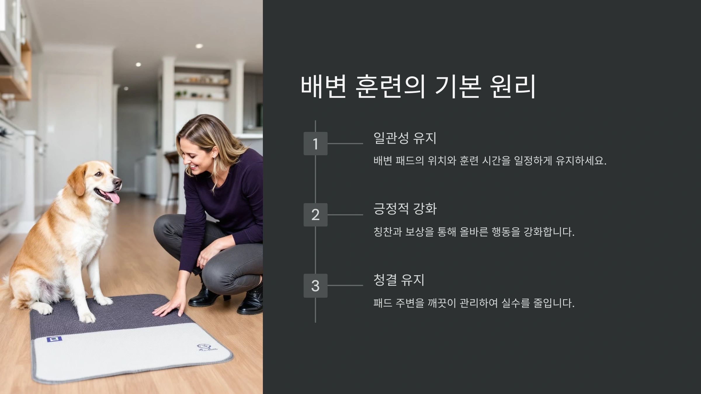 배변 훈련은 강아지가 패드 위에서만 배변하도록 돕는 중요한 과정이에요. 기본 원리는 반복적이고 일관된 교육을 통해 강아지가 올바른 장소를 인식하도록 만드는 것이에요. 특히 칭찬과 보상을 활용하면 강아지가 원하는 행동을 더 잘 이해하고 기억할 수 있어요.