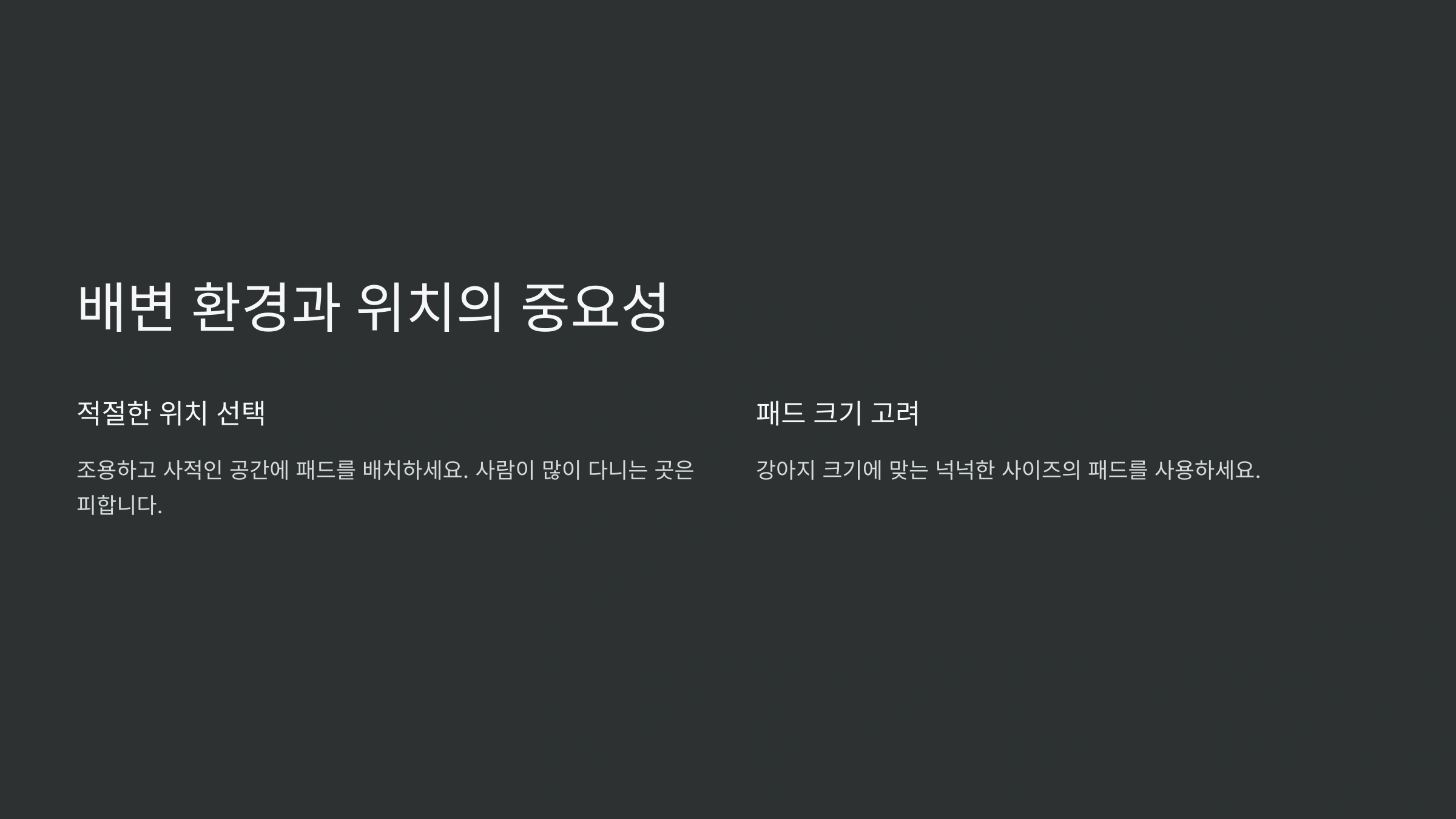 두 번째로는 배변 패드의 위치를 신중하게 선택하는 거예요. 조용하고 강아지가 편안함을 느낄 수 있는 곳에 패드를 놓아야 해요. 사람이 자주 지나다니는 복도나 소음이 많은 곳은 피하는 것이 좋아요. 강아지가 스트레스 받지 않는 환경이 성공적인 훈련의 기본이에요.