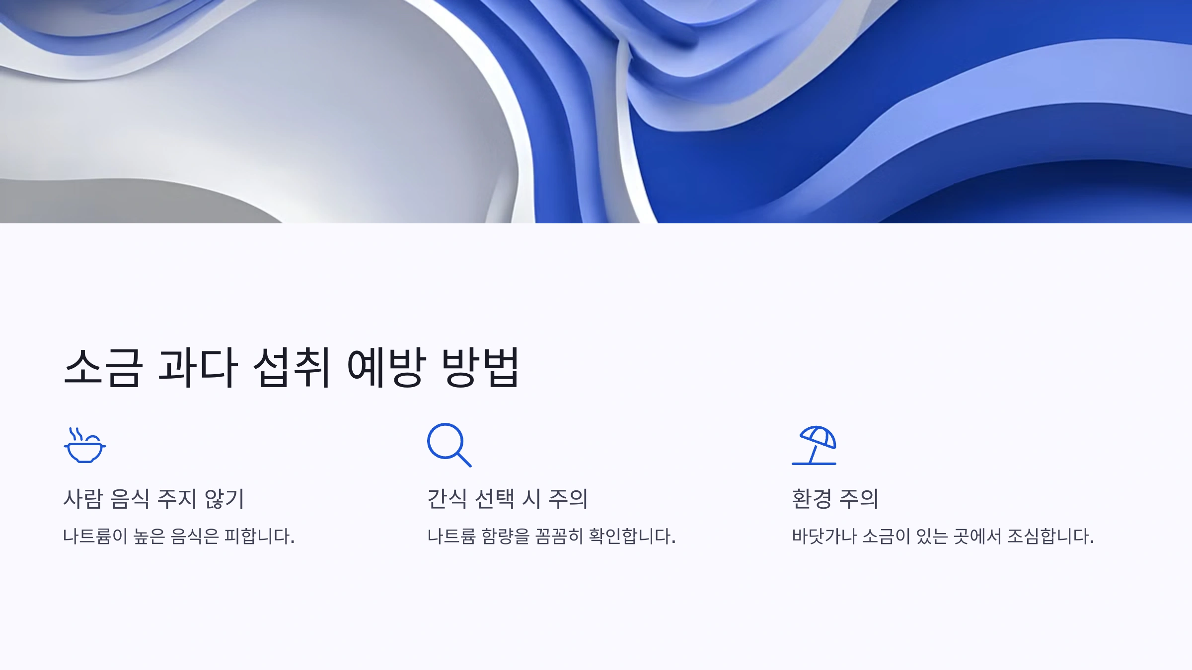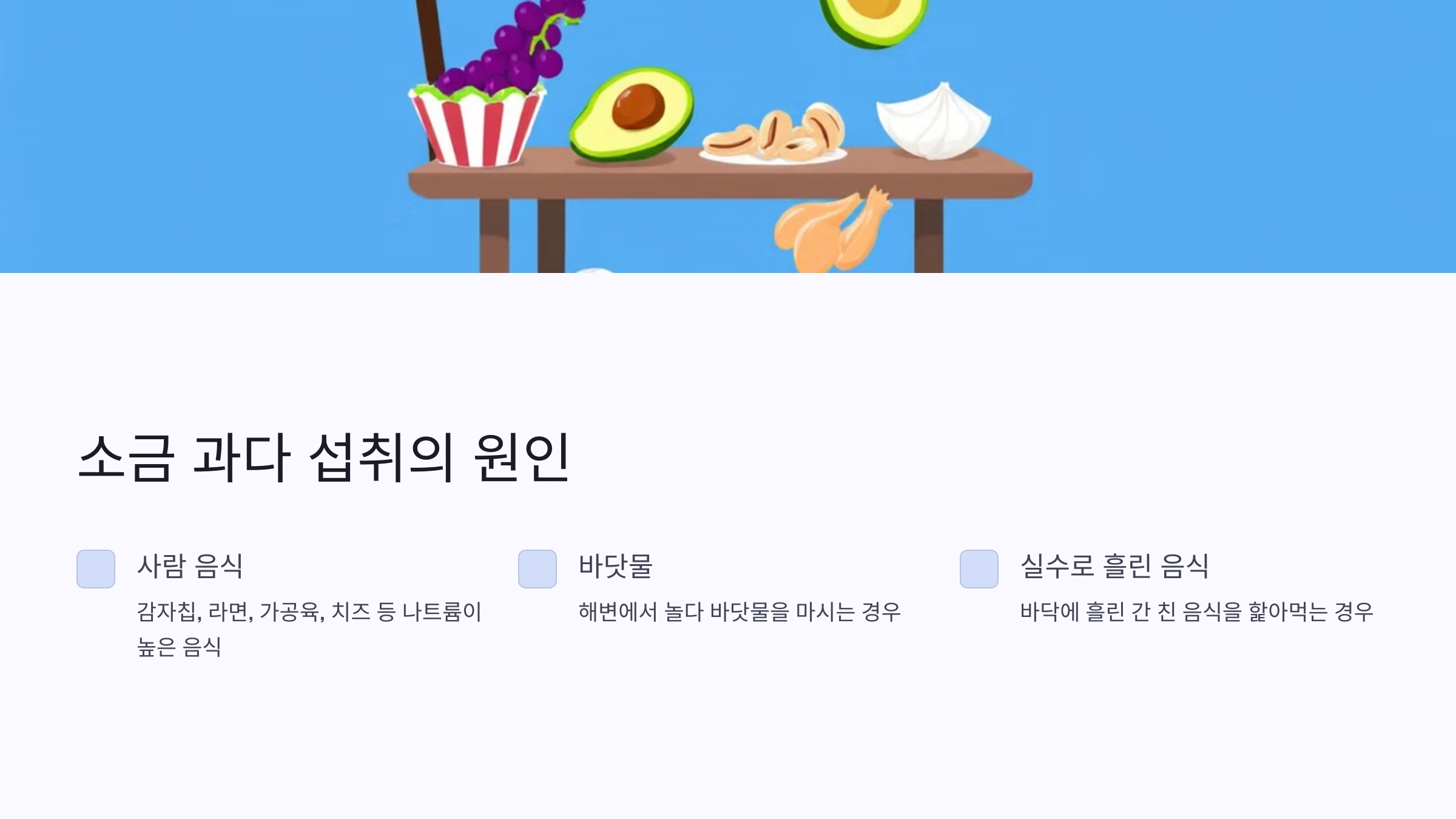 3. 바닷가나 소금이 있는 환경에서 주의하기: 해변에서 놀 때 강아지가 바닷물을 마시지 않도록 하고, 실내에서도 소금을 실수로 흘리지 않도록 조심해야 해요.