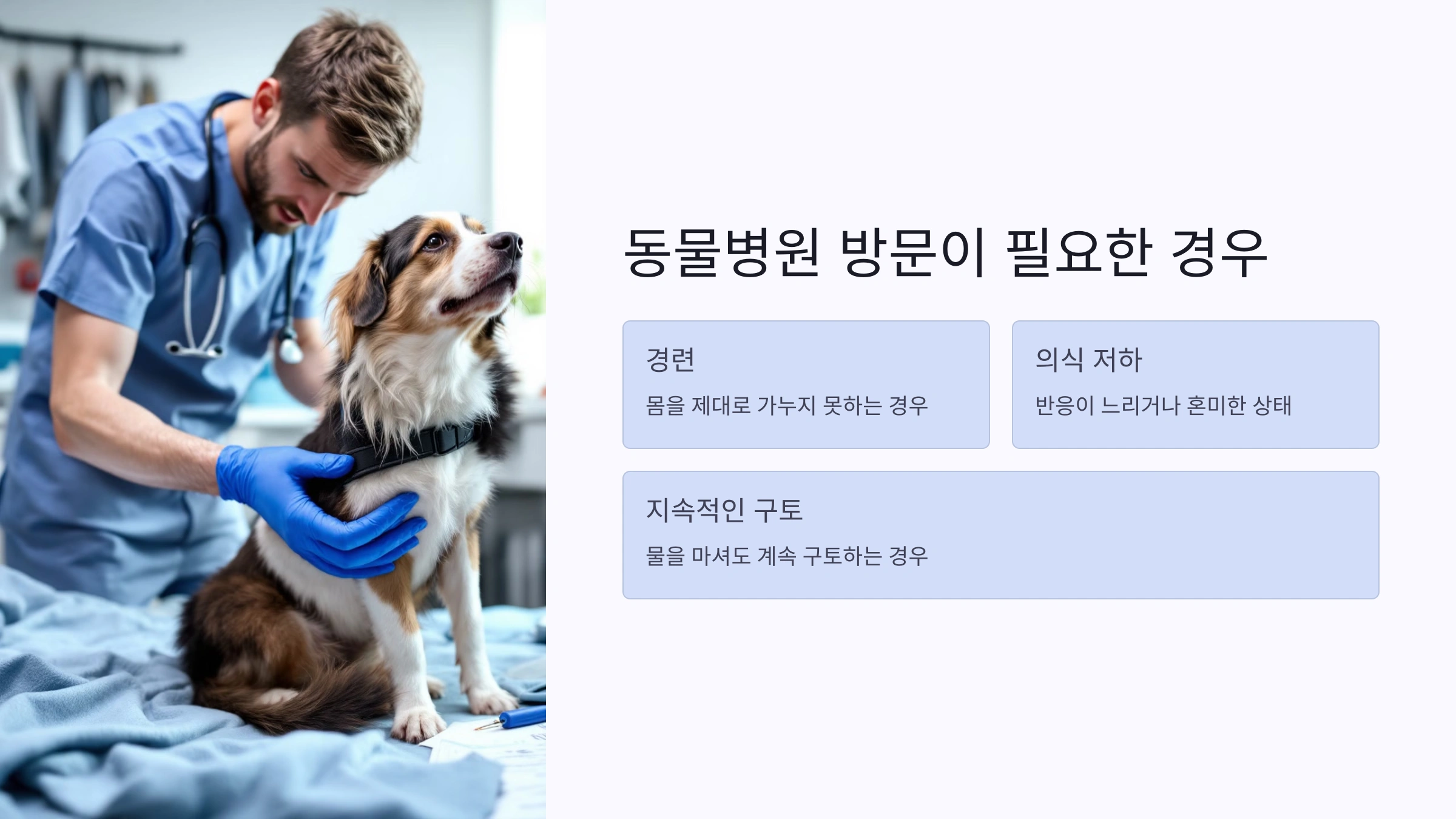 응급 처치 후에도 강아지가 계속 이상 증상을 보인다면 동물병원에 가야 해요. 특히 아래 증상이 나타나면 즉시 병원으로 데려가야 해요.