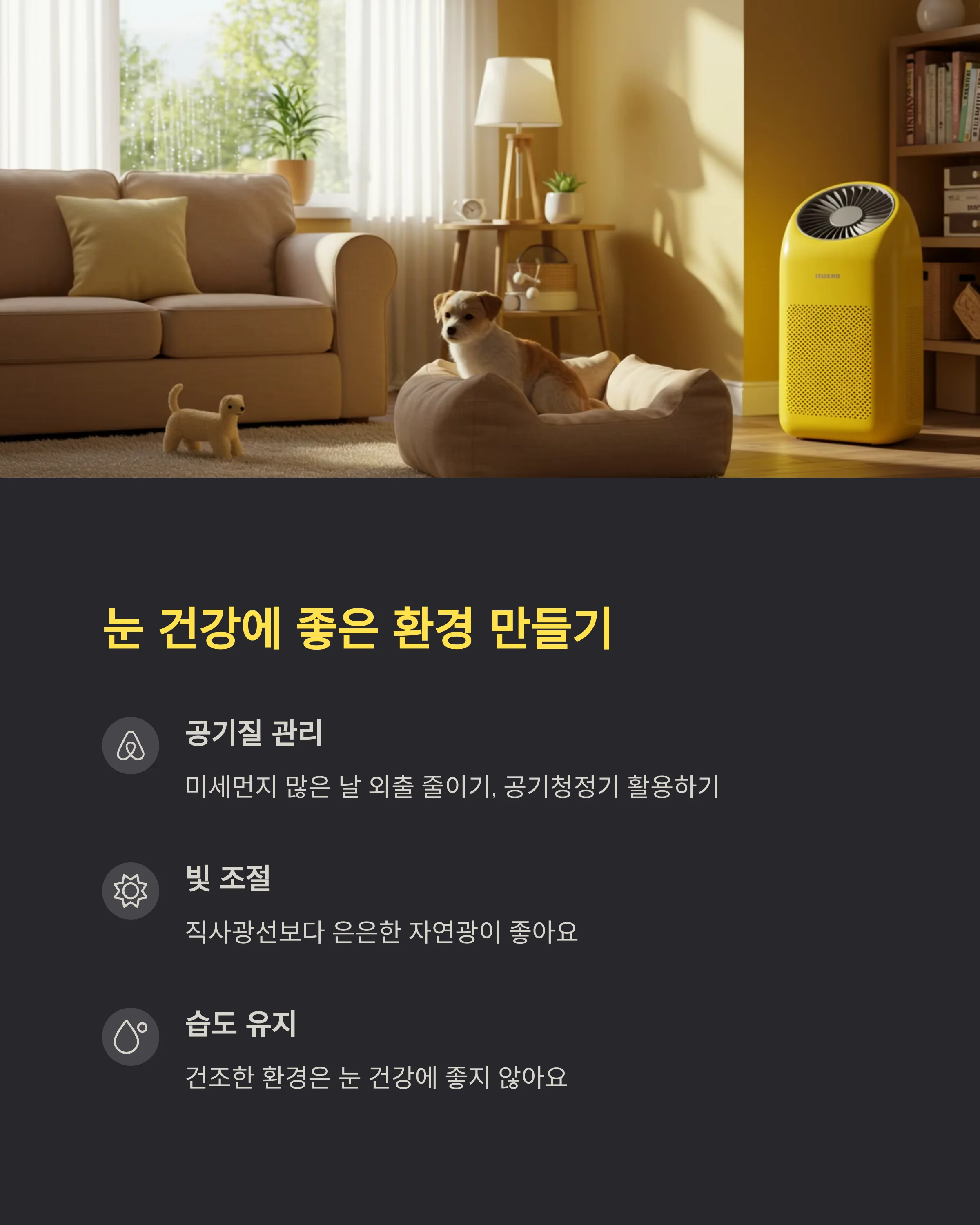 눈 건강을 지키기 위해서는 주변 환경도 아주 중요해요. 실내에서 생활하는 강아지와 고양이의 경우, 공기 중 먼지, 건조함, 햇빛 자극 등이 눈에 영향을 줄 수 있기 때문에 관리가 꼭 필요하답니다.