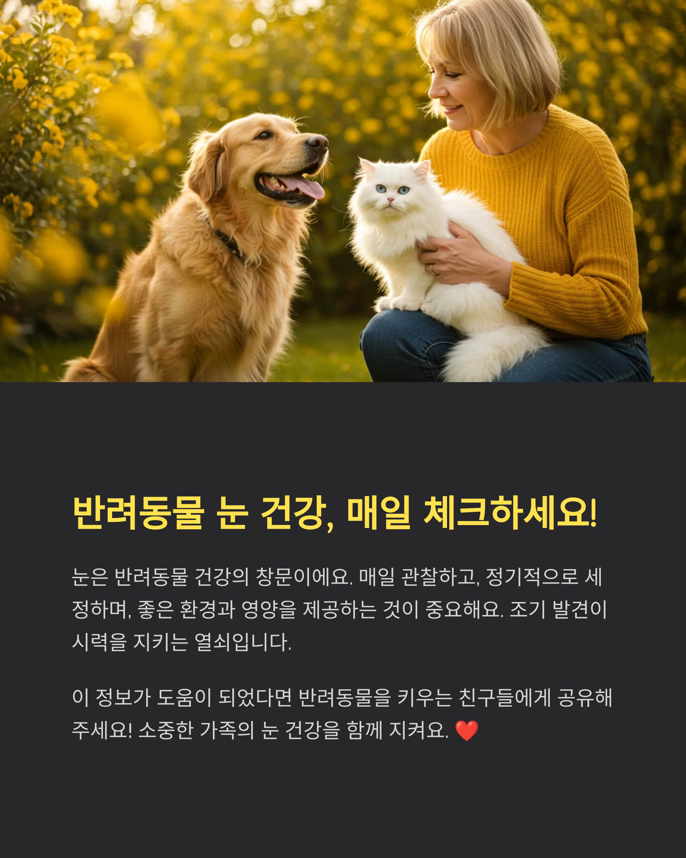 강아지나 고양이는 스스로 눈을 관리할 수 없기 때문에 보호자의 역할이 정말 중요해요. 눈 건강을 꾸준히 지켜주면 질병을 예방할 수 있고, 나이가 들어서도 시력을 유지할 수 있답니다. 노령견, 노령묘일수록 더 민감하게 체크해줘야 해요.