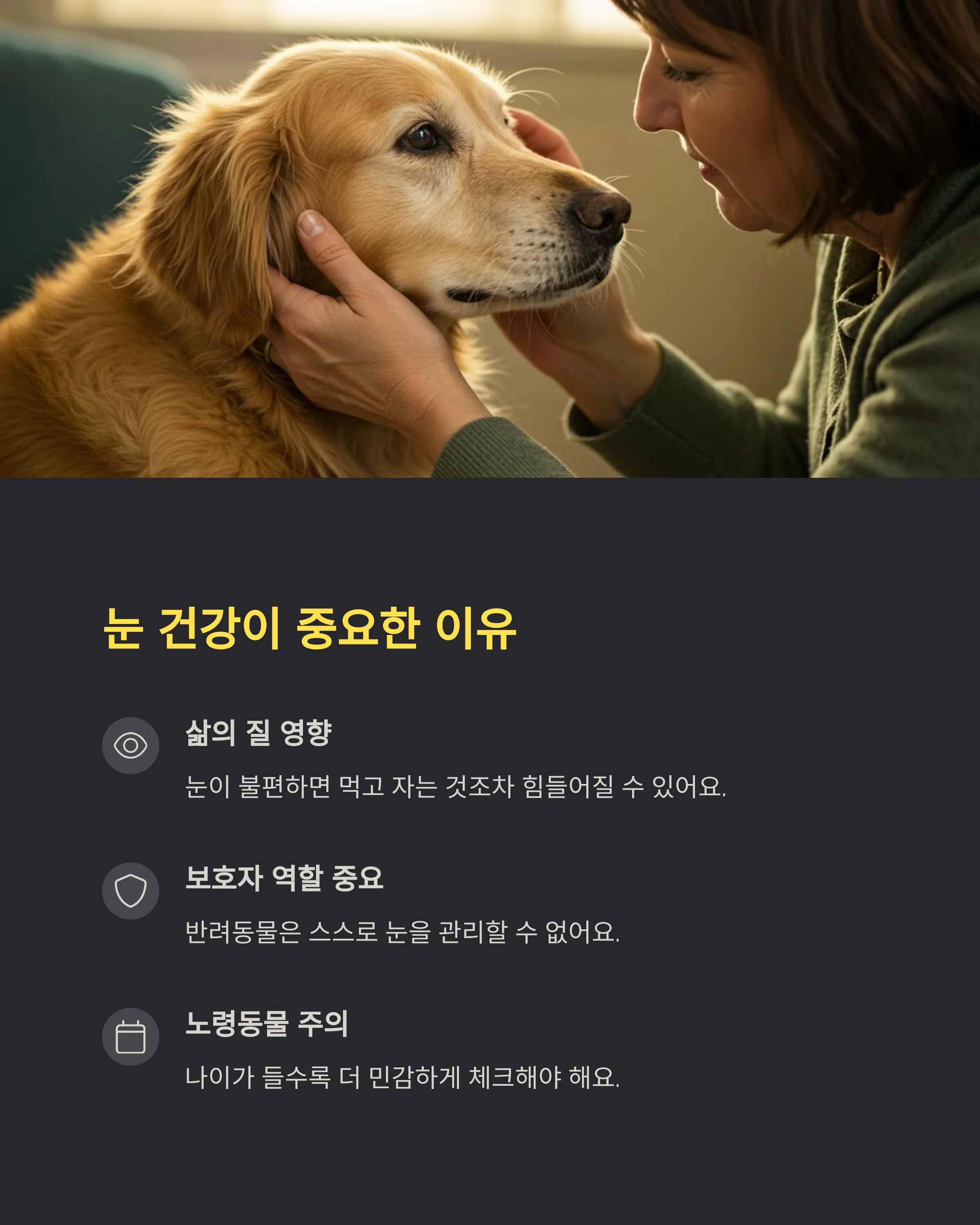 사람이 시력을 잃으면 일상생활이 어려워지듯, 반려동물도 눈에 문제가 생기면 삶의 질이 크게 떨어져요. 특히 실내 생활을 하는 반려동물에게 눈은 외부 환경을 감지하는 중요한 센서예요. 눈이 불편하면 먹고 자는 것조차 힘들어질 수 있어요.
