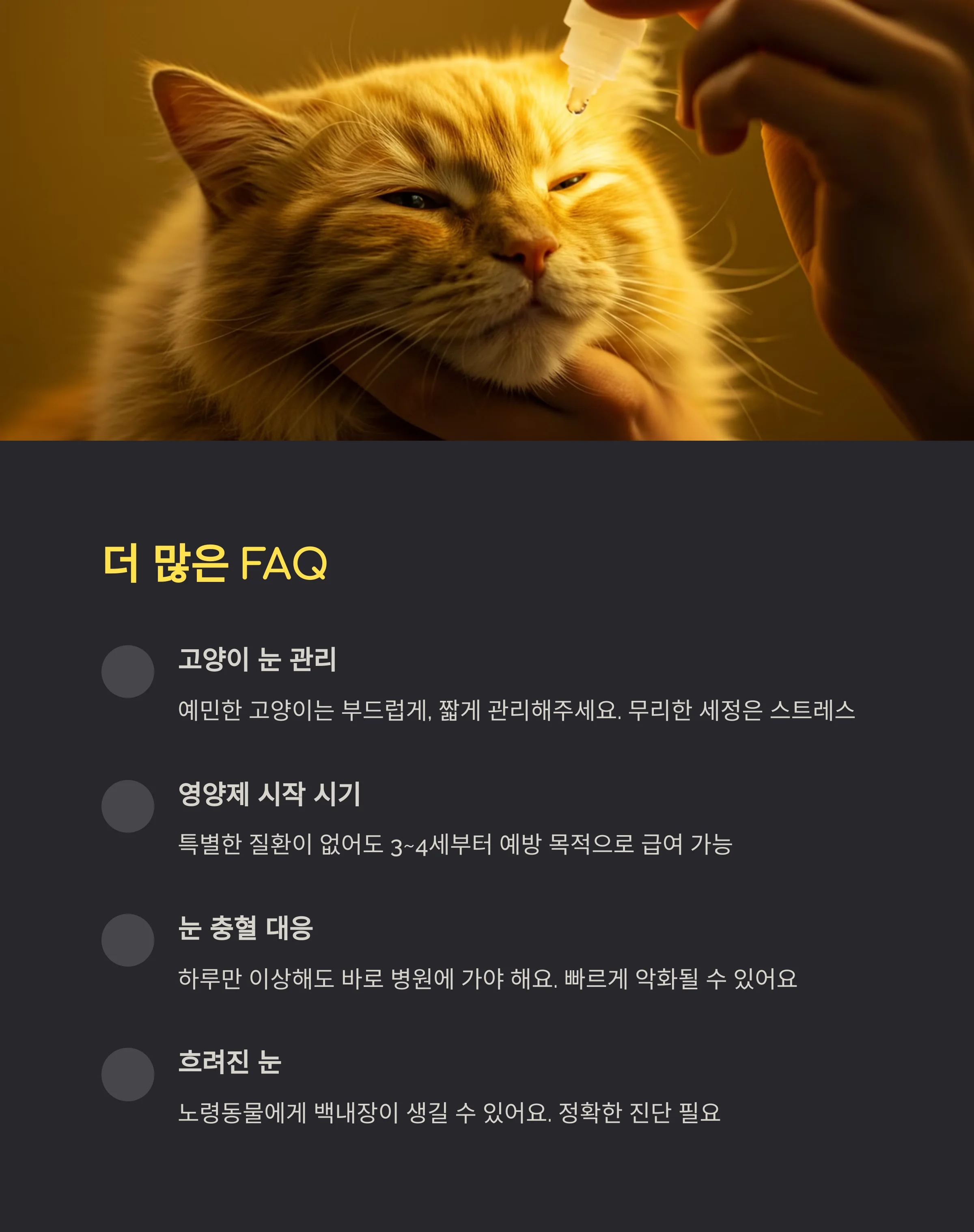 A4. 고양이는 예민해서 눈 관리 시 부드럽게, 짧게 해주는 게 좋아요. 무리한 눈 세정은 오히려 스트레스예요.