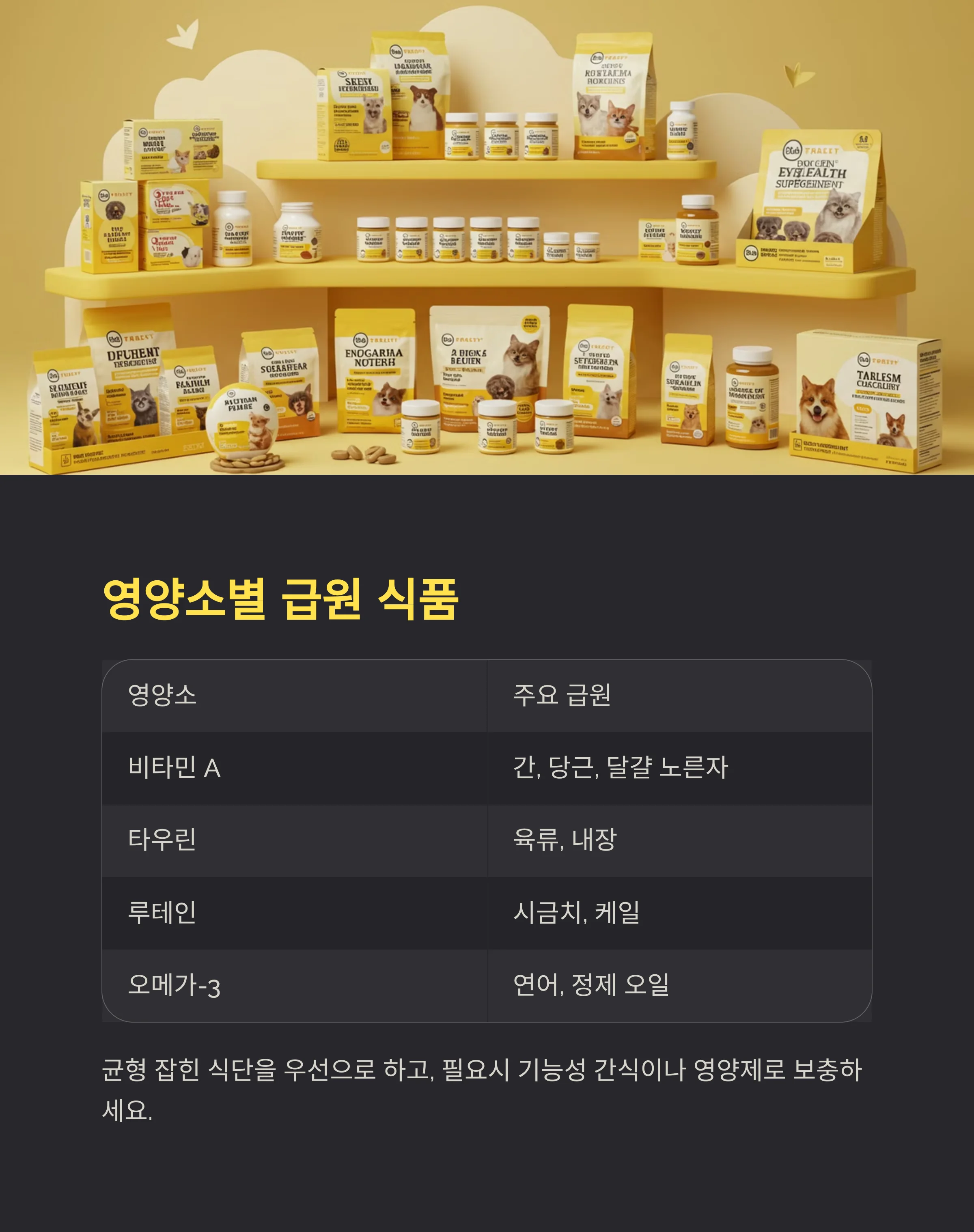 다음은 눈 건강에 중요한 '영양소'에 대한 이야기를 해볼게요! 어떤 음식을 챙겨주면 좋은지 자세히 소개할게요 🥕🐾