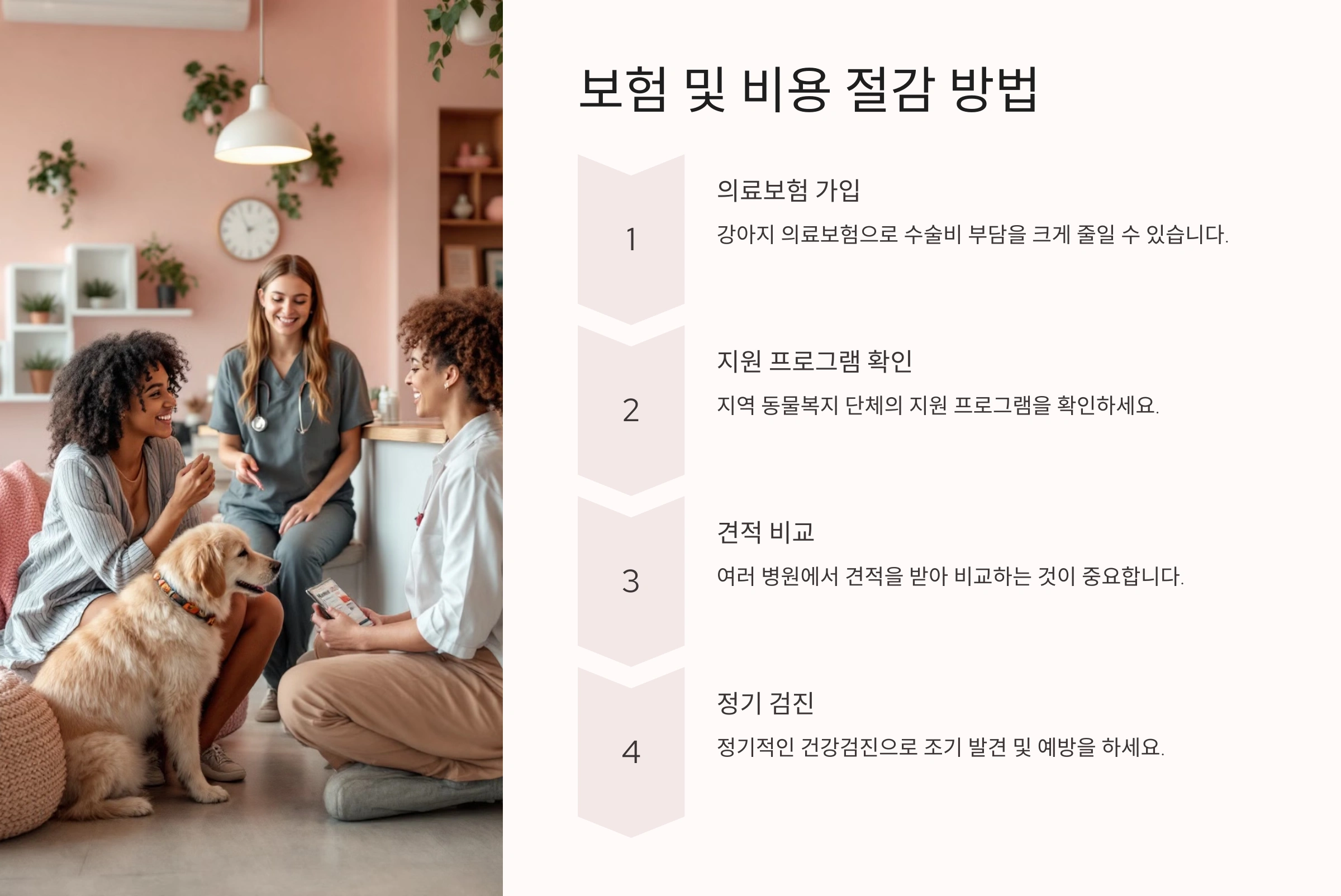 의료비 지원 프로그램이나 강아지 보험을 활용하면 비용 부담을 줄일 수 있습니다. 특히 강아지 의료보험은 수술 비용과 재활치료비 일부를 보장하며, 이로 인해 총비용의 30~50%를 절감할 수 있습니다.
