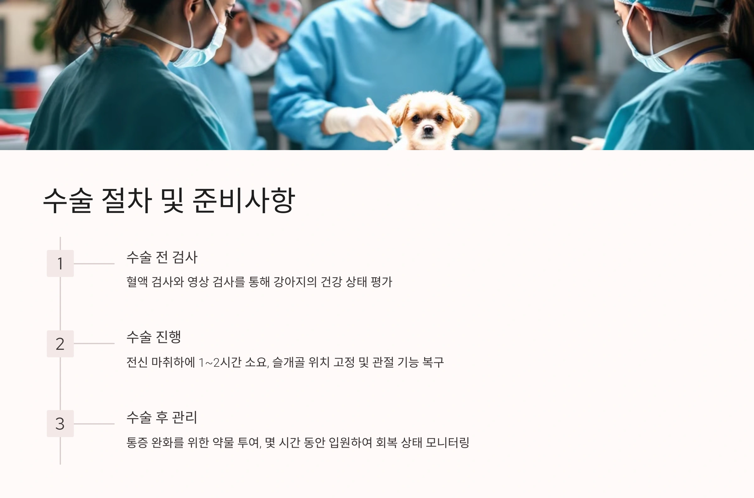 슬개골 탈구 수술은 무릎 관절의 구조를 복구하고 슬개골을 안정적으로 고정하는 데 목적이 있습니다. 성공적인 수술을 위해 다음과 같은 준비 과정과 절차가 진행됩니다.