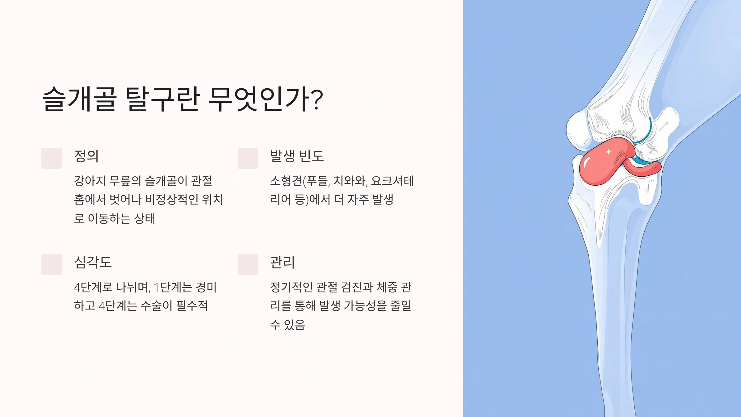 슬개골 탈구는 강아지의 무릎 관절에서 슬개골(무릎뼈)이 제자리에서 벗어나 비정상적인 위치로 이동하는 상태를 말합니다. 슬개골은 무릎 관절 앞쪽에 위치하며, 대퇴골의 홈(groove) 안에 정상적으로 자리 잡고 있어야 합니다. 하지만 특정 요인으로 인해 이 홈에서 벗어나게 되면 슬개골 탈구가 발생합니다. 이 질환은 특히 소형견에서 흔하며, 푸들, 치와와, 요크셔테리어 같은 품종에서 유전적 소인이 높습니다.