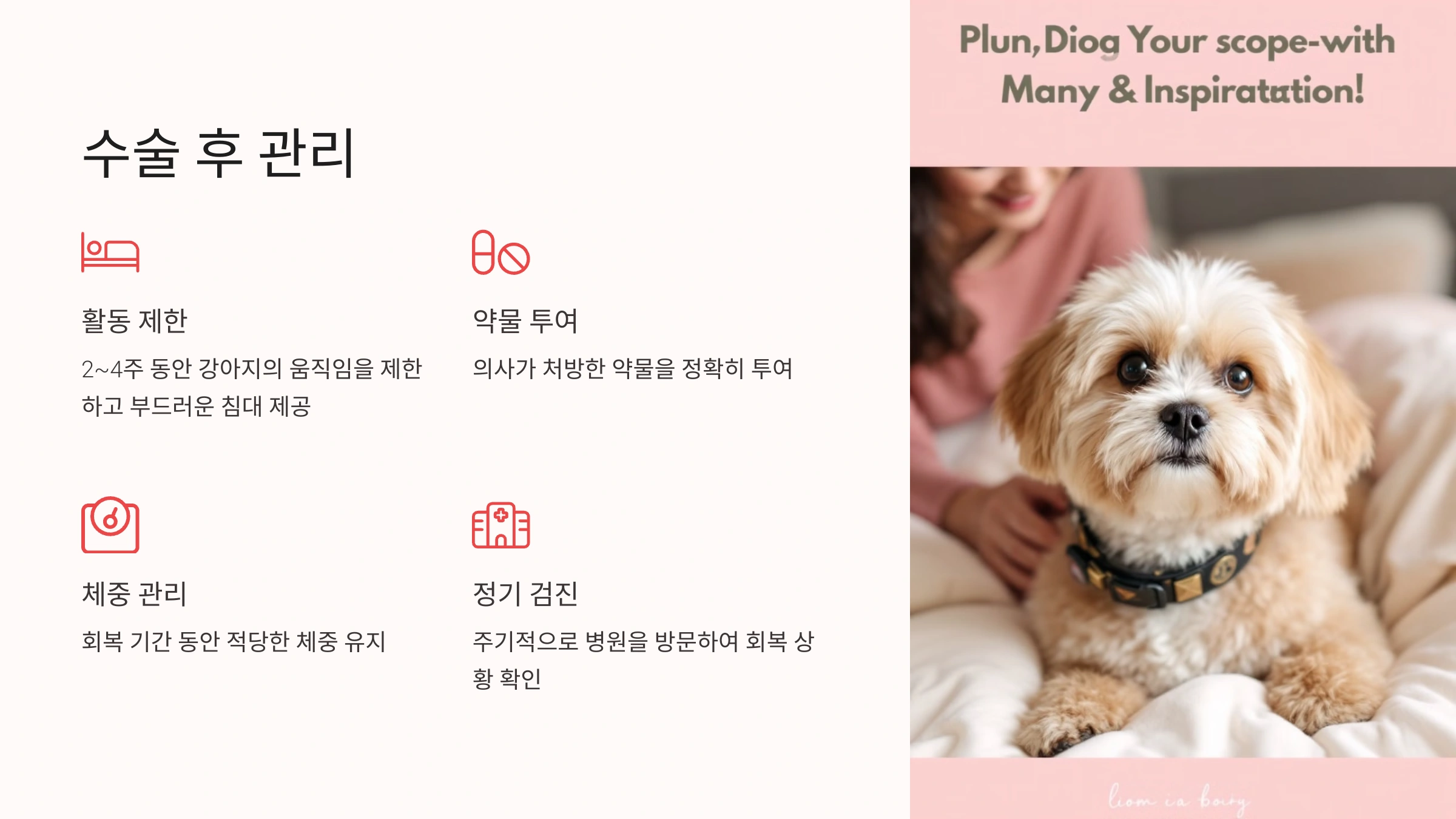수술 후에는 통증 완화를 위해 진통제가 투여되며, 강아지는 몇 시간 동안 병원에서 관찰을 받습니다. 보호자는 수술 후 강아지를 집으로 데려간 후에도 무리한 활동을 제한하고, 수의사의 지시에 따라 약물 투여 및 재활치료를 병행해야 합니다.