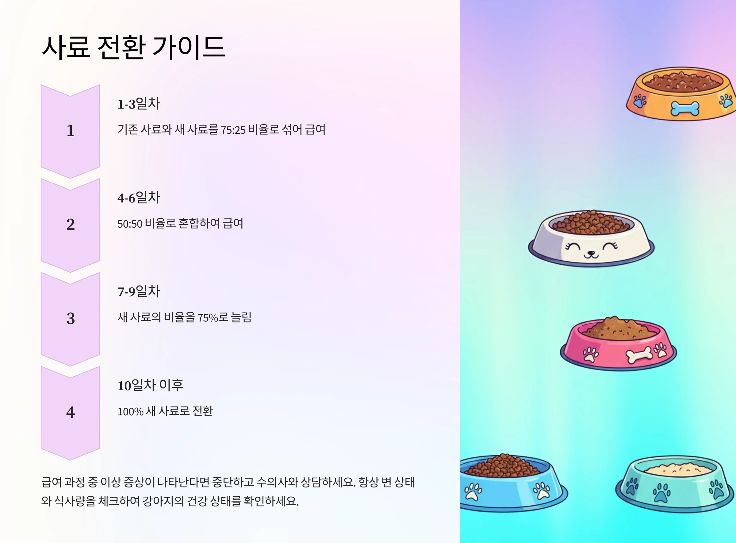 - 기존 사료에서 전환할 때는 점진적으로 섞어 급여하며, 강아지가 새로운 사료에 적응할 시간을 충분히 줘야 합니다.