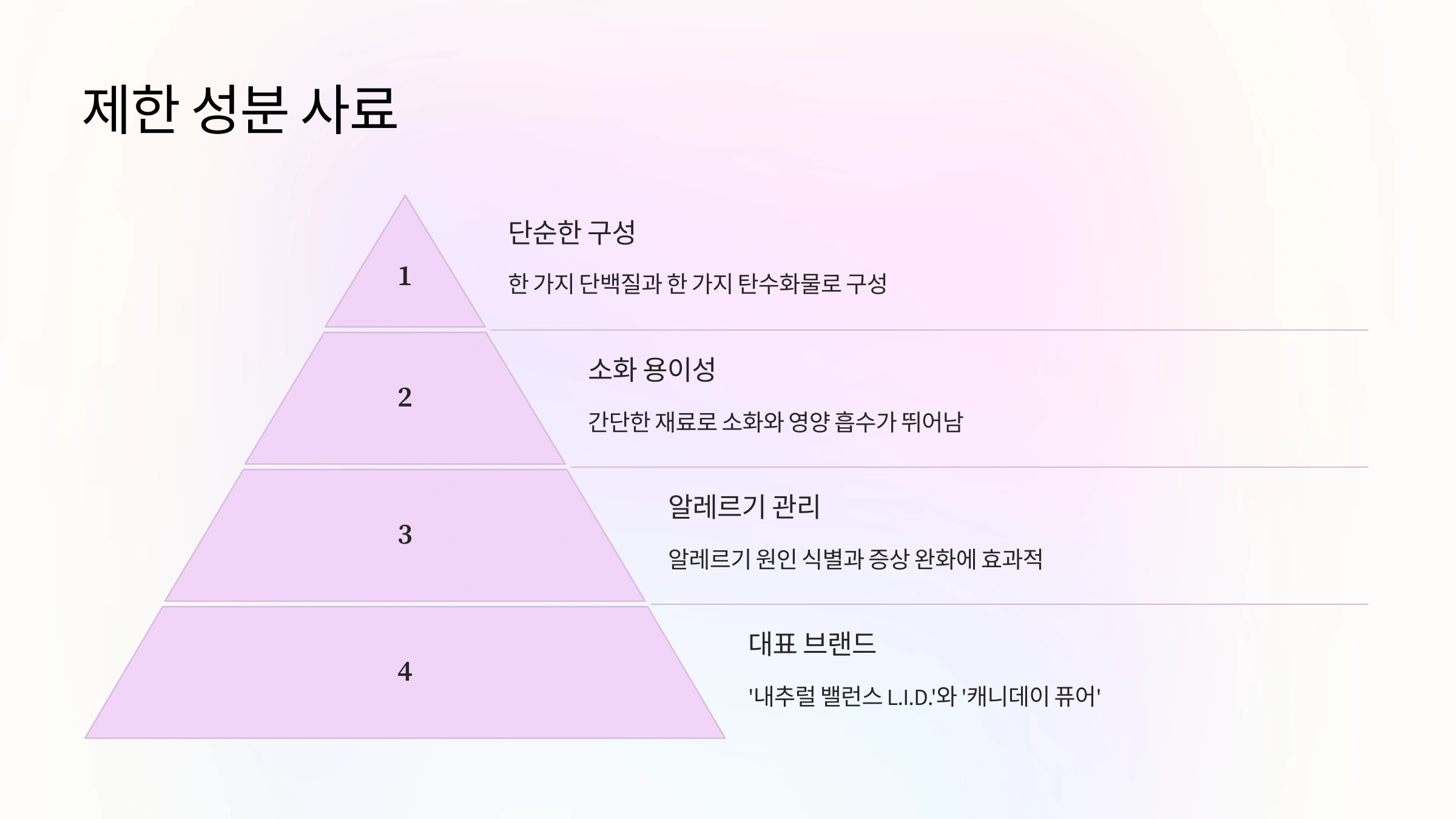 - 주로 한 가지 단백질과 한 가지 탄수화물로 구성되어 있어, 알레르기 유발 원인을 확인하거나 관리하는 데 용이합니다.