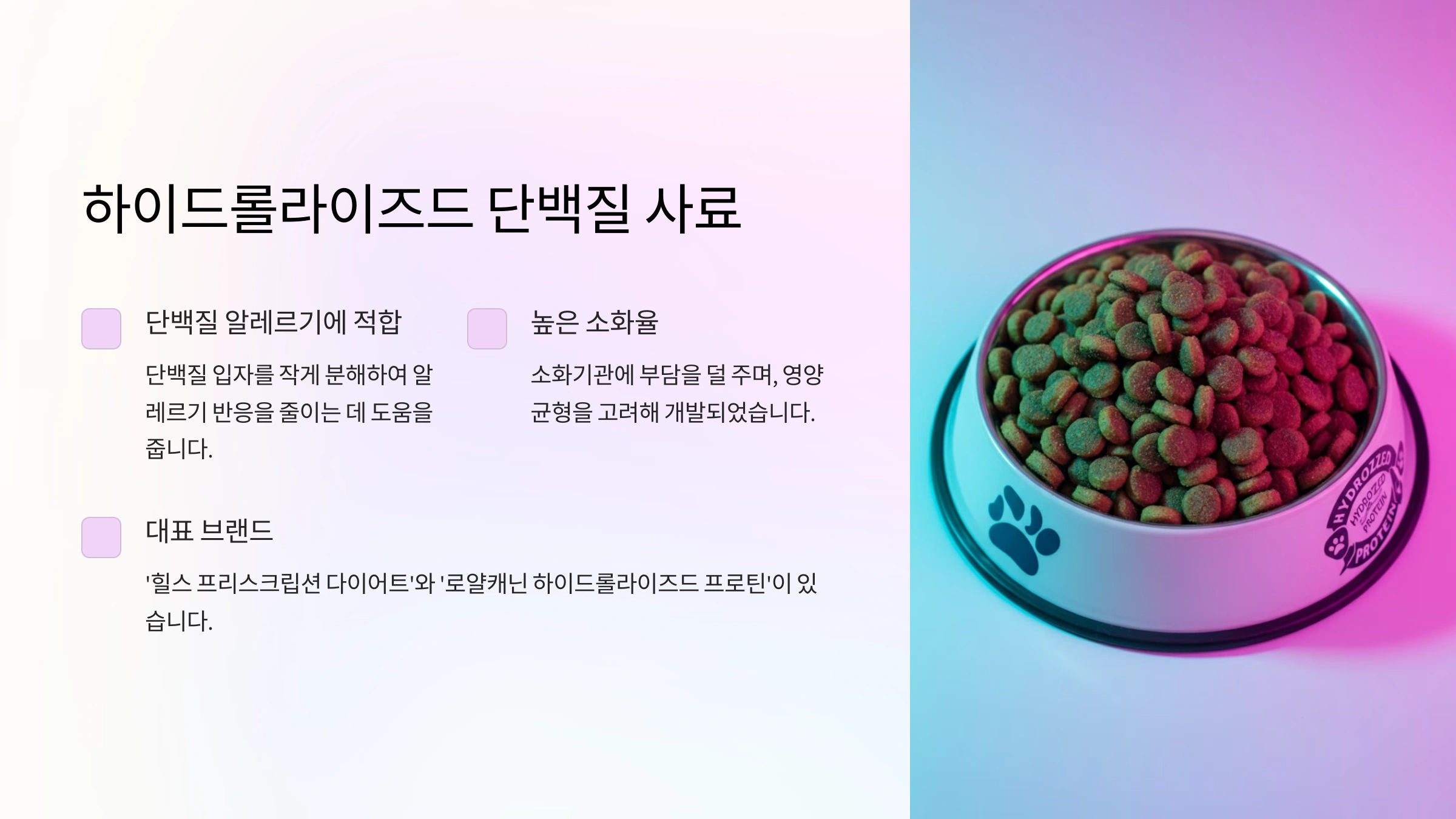 하이드롤라이즈드 단백질 사료는 알레르기를 일으킬 가능성을 크게 줄인 제품으로, 단백질을 미세한 입자로 분해하여 면역 체계가 알레르기 반응을 일으키지 않도록 돕습니다.