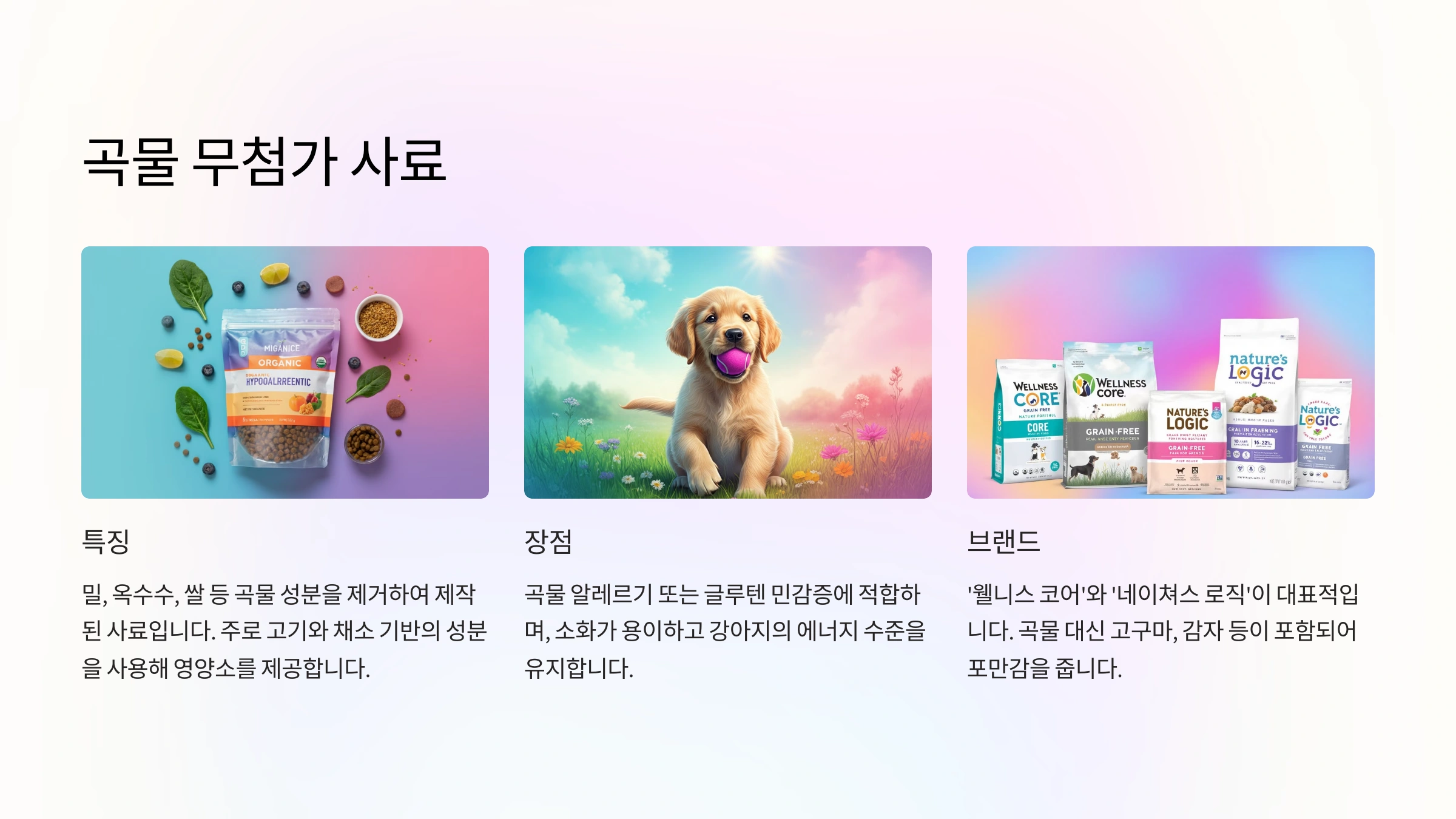 - 곡물 무첨가 사료는 강아지의 소화와 피부 건강을 개선하며, 피부 발진이나 가려움증을 줄이는 데 도움을 줍니다.