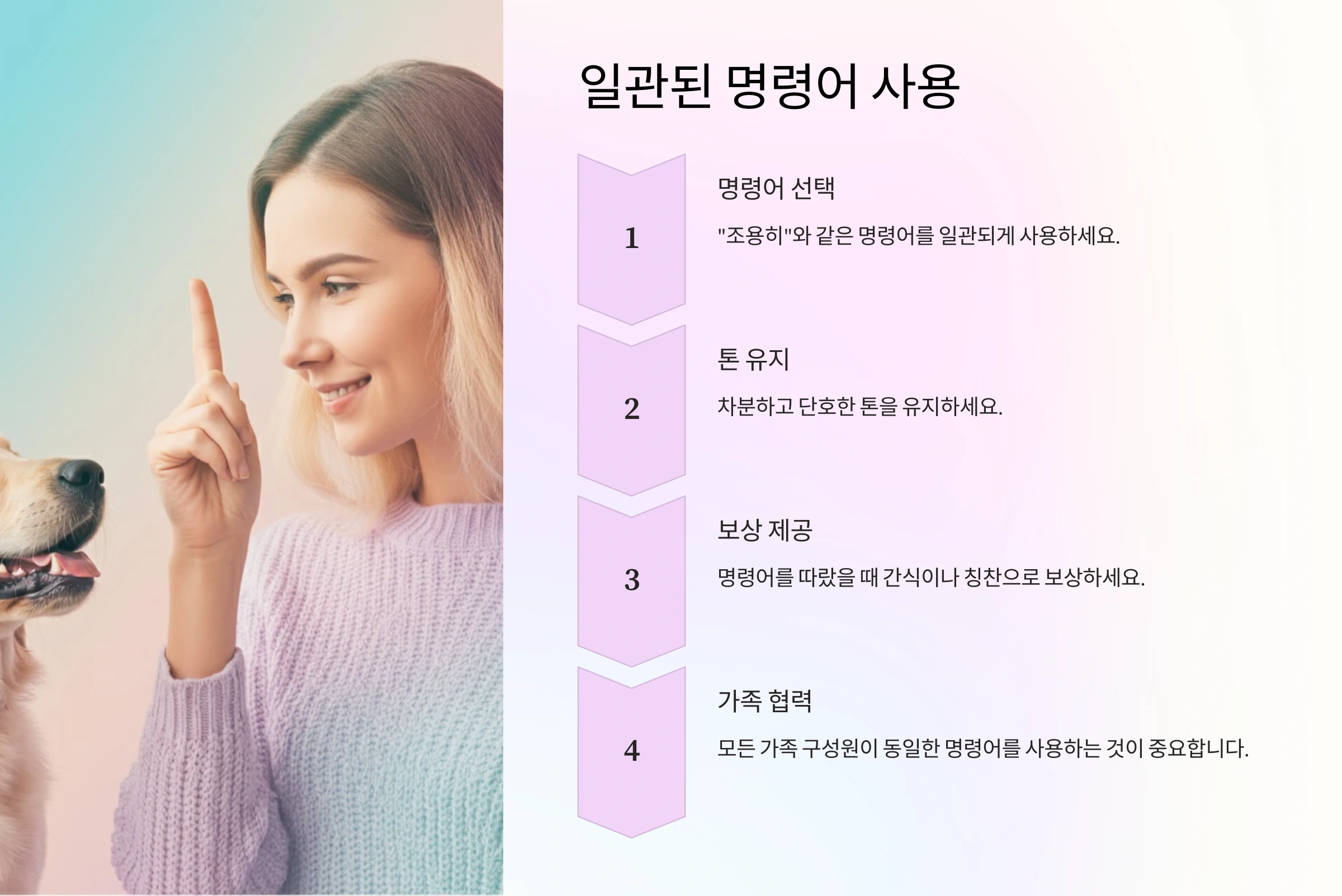 훈련 시, "조용히", "멈춰"와 같은 짧고 간단한 명령어를 일관되게 사용하는 것이 중요합니다. 동일한 명령어를 반복적으로 사용하면 강아지가 이를 쉽게 학습하고, 올바른 행동과 연결 지을 수 있습니다.