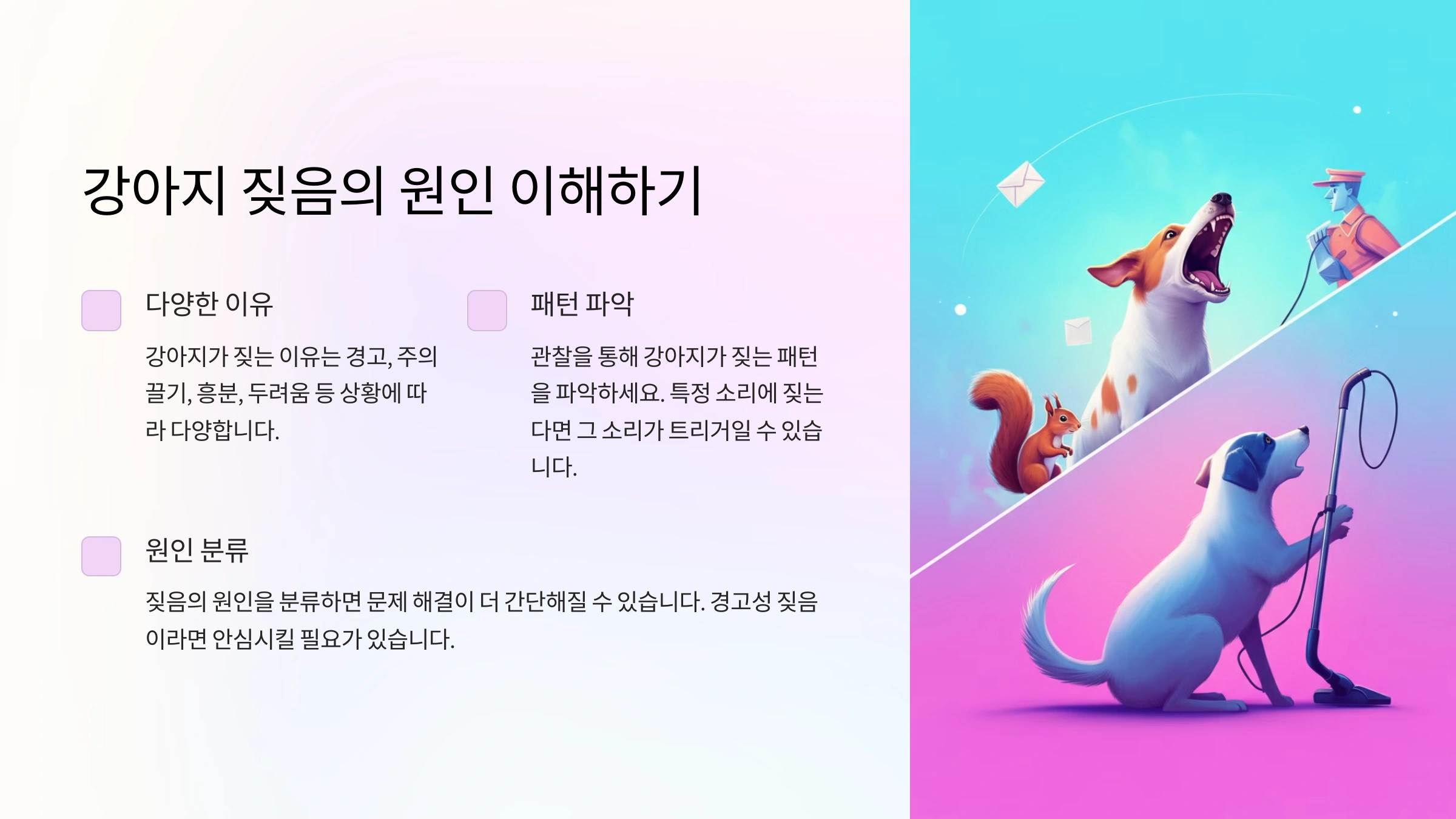 강아지의 짖음은 자연스러운 행동이므로 완전히 멈추기보다는 과도한 짖음을 줄이는 것이 현실적입니다.