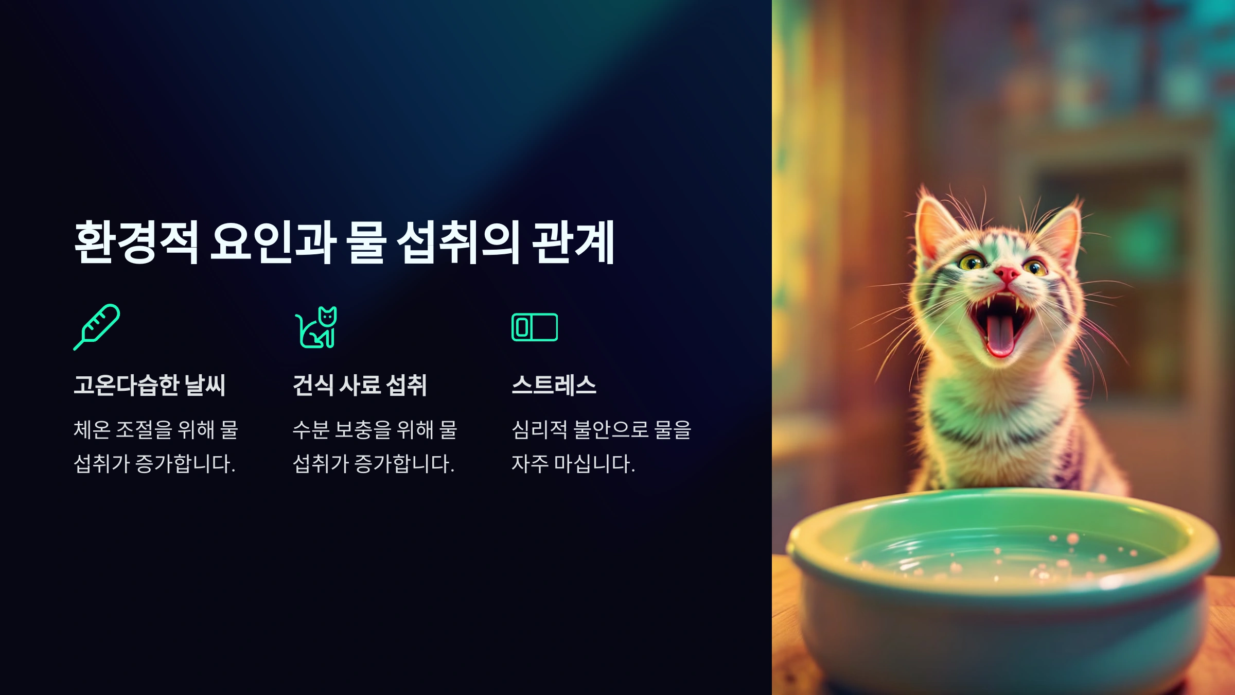 🐱 고양이가 물을 많이 마시는 이유는 질병뿐만 아니라 환경적인 요인 때문일 수도 있어요. 기온, 식단 변화, 스트레스 등도 고양이의 수분 섭취에 영향을 줄 수 있어요.