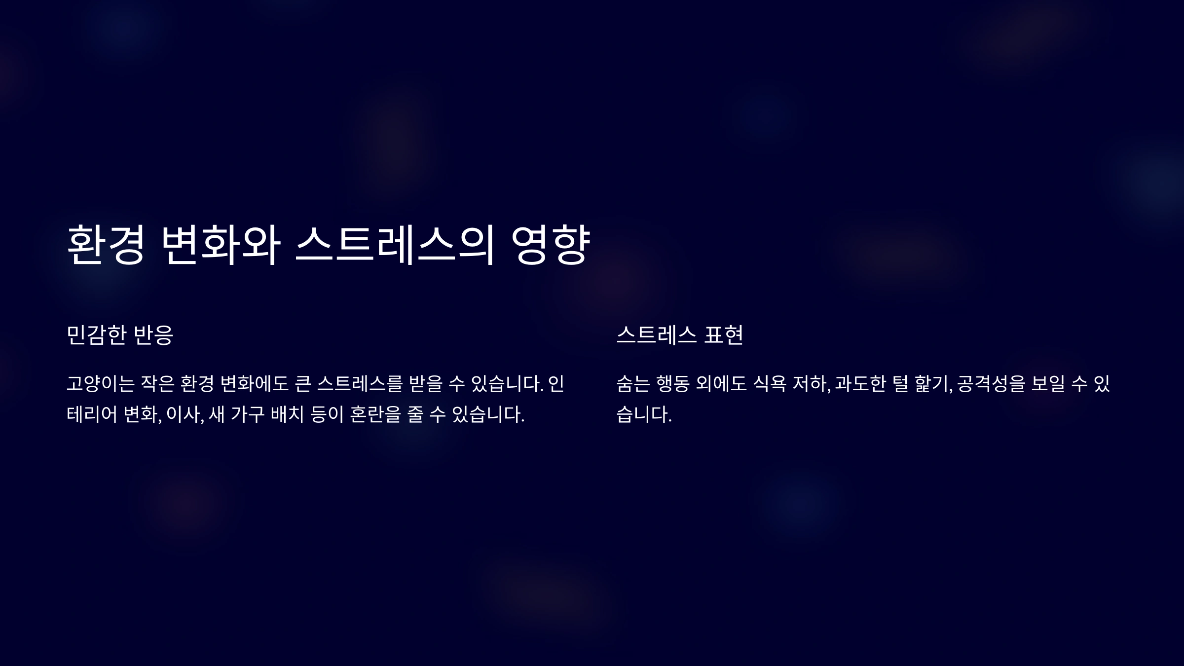 고양이는 변화에 매우 민감한 동물이기 때문에, 작은 환경 변화도 큰 스트레스로 느낄 수 있어요. 예를 들어, 집안 인테리어의 변화, 이사, 새 가구 배치 등이 고양이에게 혼란을 줄 수 있어요. 이러한 변화는 고양이가 자신의 영역이 침범당했다고 느끼게 만들 수 있답니다.