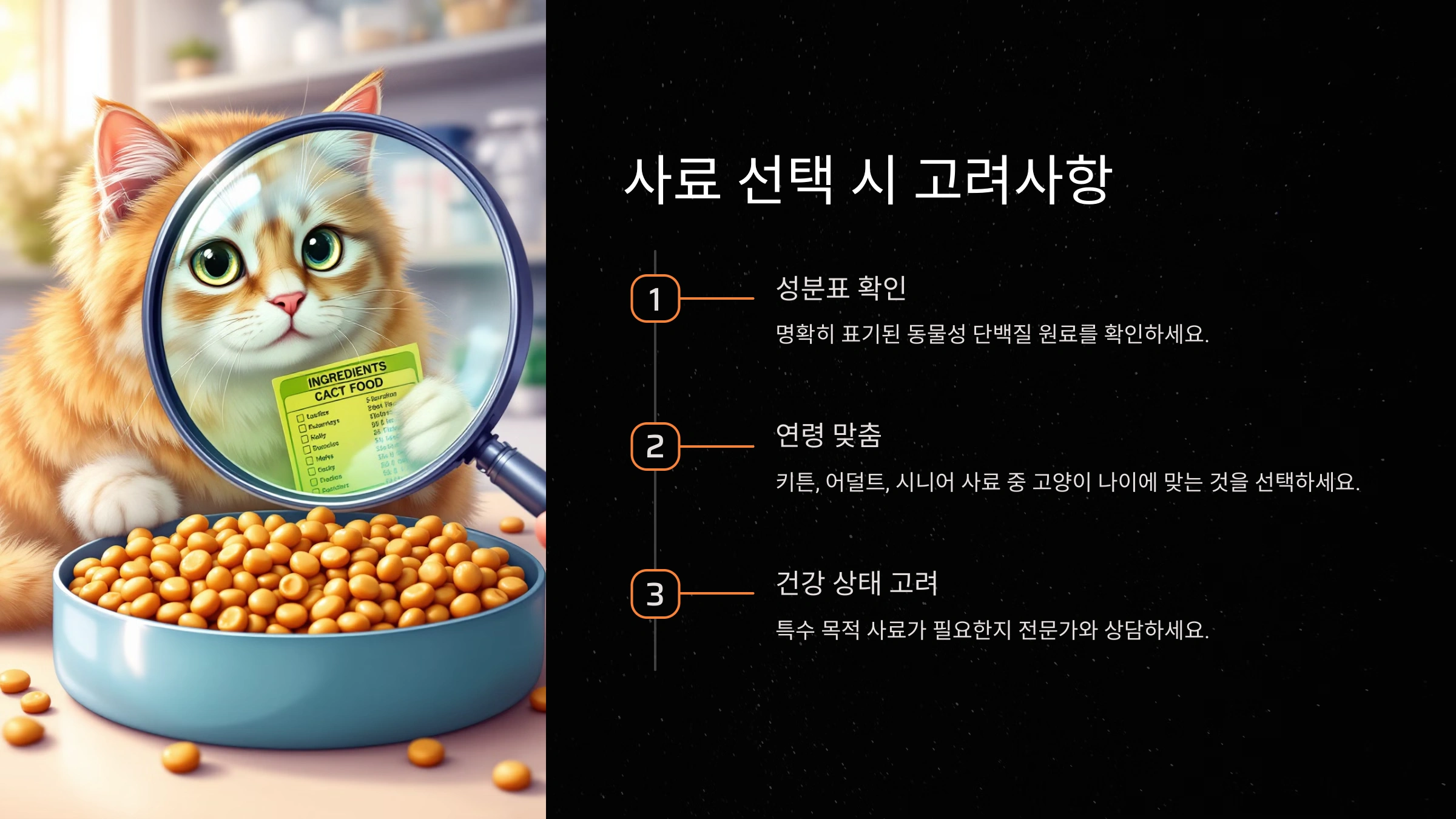 사료 선택은 단순히 브랜드만 보고 결정할 문제가 아니에요. 고양이의 나이, 활동량, 건강 상태에 따라 어떤 사료가 적합한지 잘 알아봐야 해요. 이를 통해 고양이가 건강하게 성장하고 생활할 수 있도록 도울 수 있답니다. 그럼 아래 내용을 따라 하나씩 살펴볼까요?