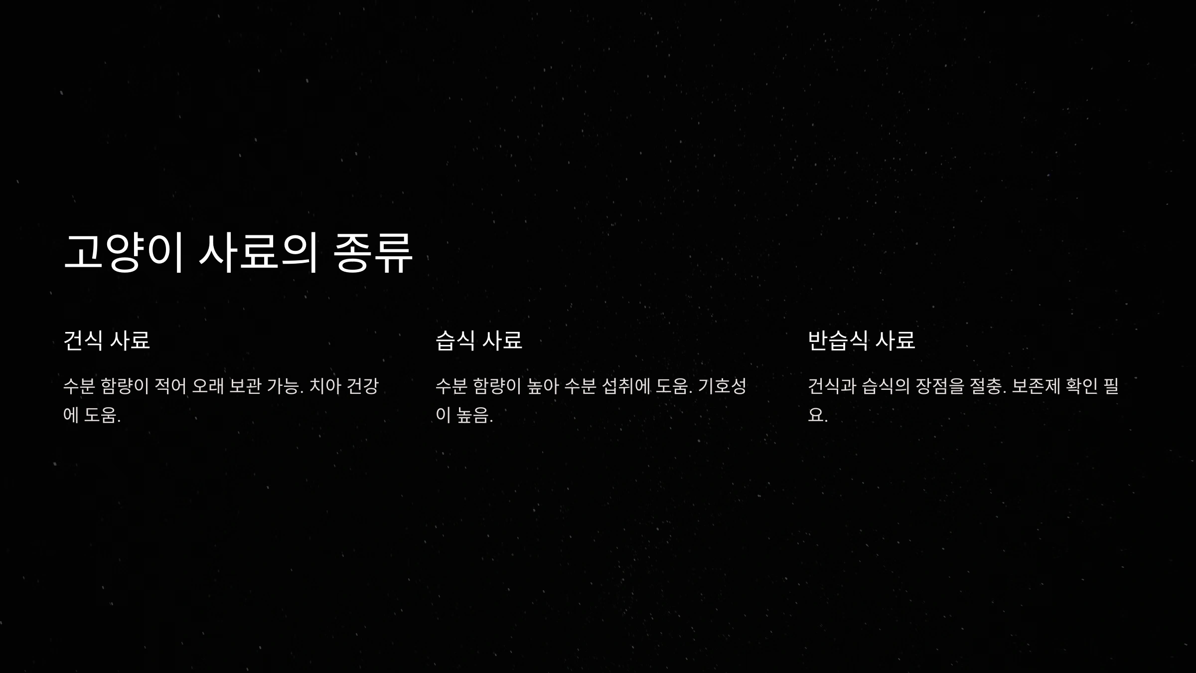 고양이 사료는 크게 건식, 습식, 반습식으로 나뉘어요. 건식 사료는 수분 함량이 적어 오래 보관할 수 있고, 씹는 과정에서 치아 건강을 유지하는 데 도움을 줄 수 있어요. 반면 습식 사료는 수분 함량이 높아 고양이의 수분 섭취를 돕고 기호성이 높아 까다로운 고양이들에게 적합하답니다.