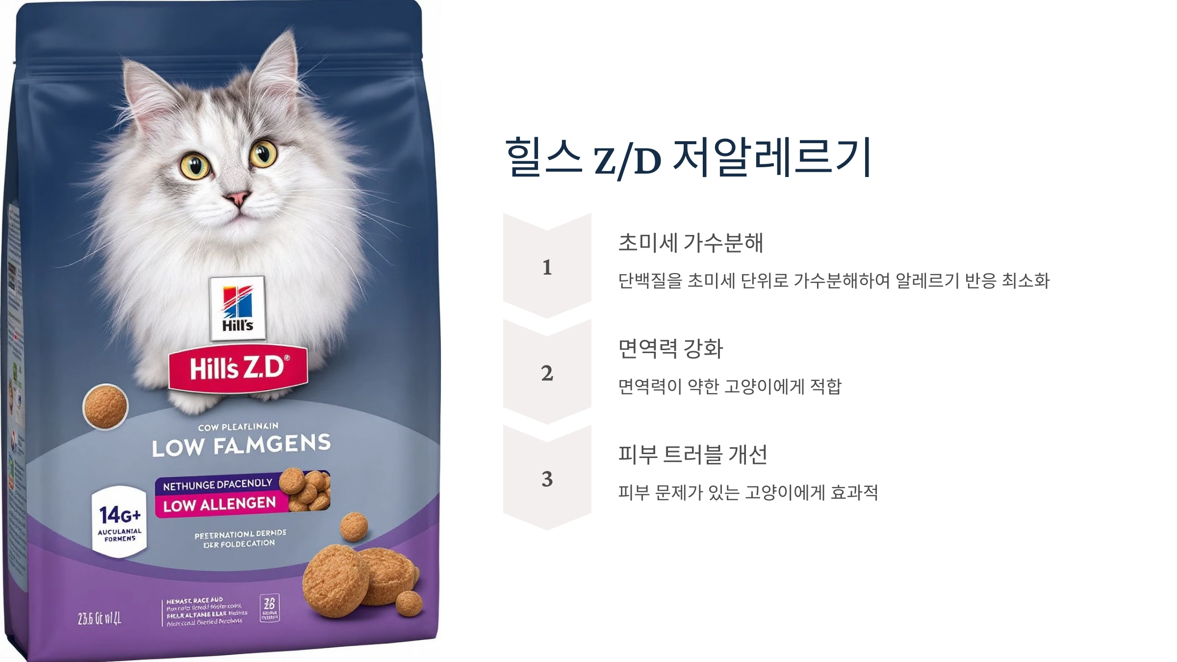 힐스의 Z/D는 단백질을 초미세 단위로 가수분해하여 알레르기 반응을 최소화한 제품이에요. 면역력이 약한 고양이에게도 좋고, 피부 트러블이 있는 경우 효과를 볼 수 있어요.