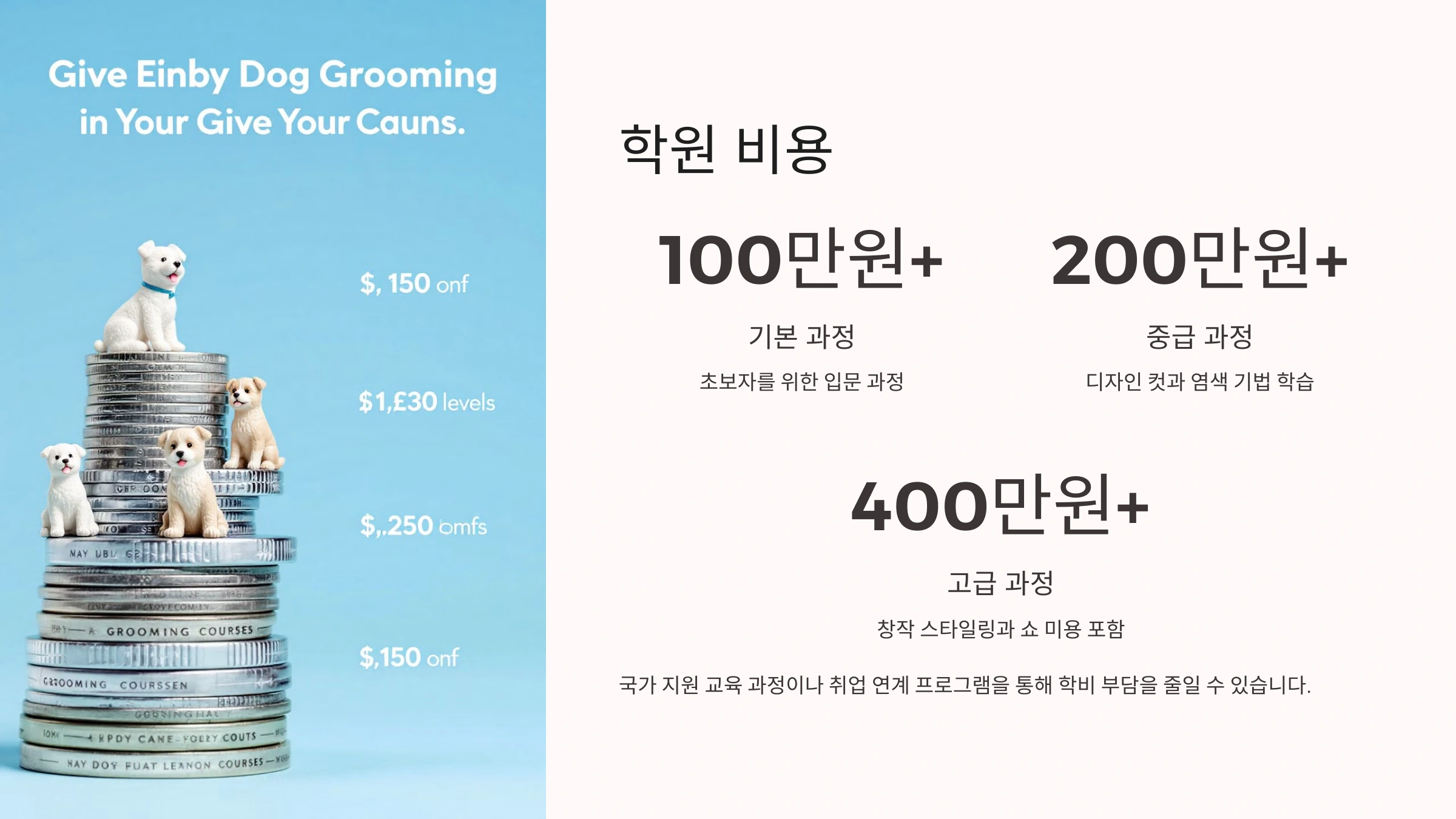 돌올그루밍 학원의 수강료는 학원마다 다르지만, 일반적으로 기본 과정은 100만 원대부터 시작해요. 중급 과정은 200~300만 원, 고급 과정은 400만 원 이상이 될 수도 있어요.