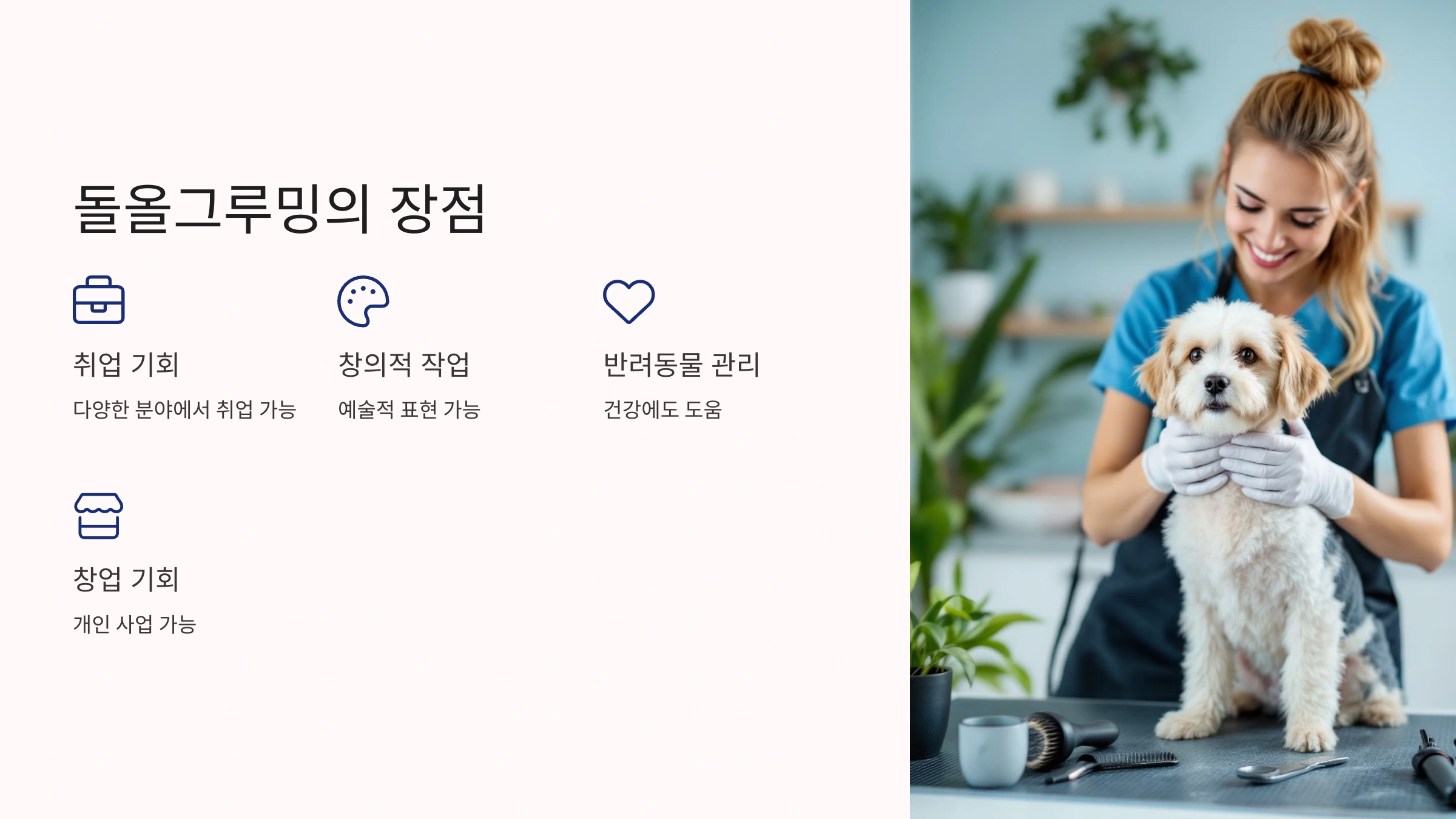 취업 기회 애견미용실, 펫숍, 반려동물 카페 등 다양한 분야에서 취업 가능