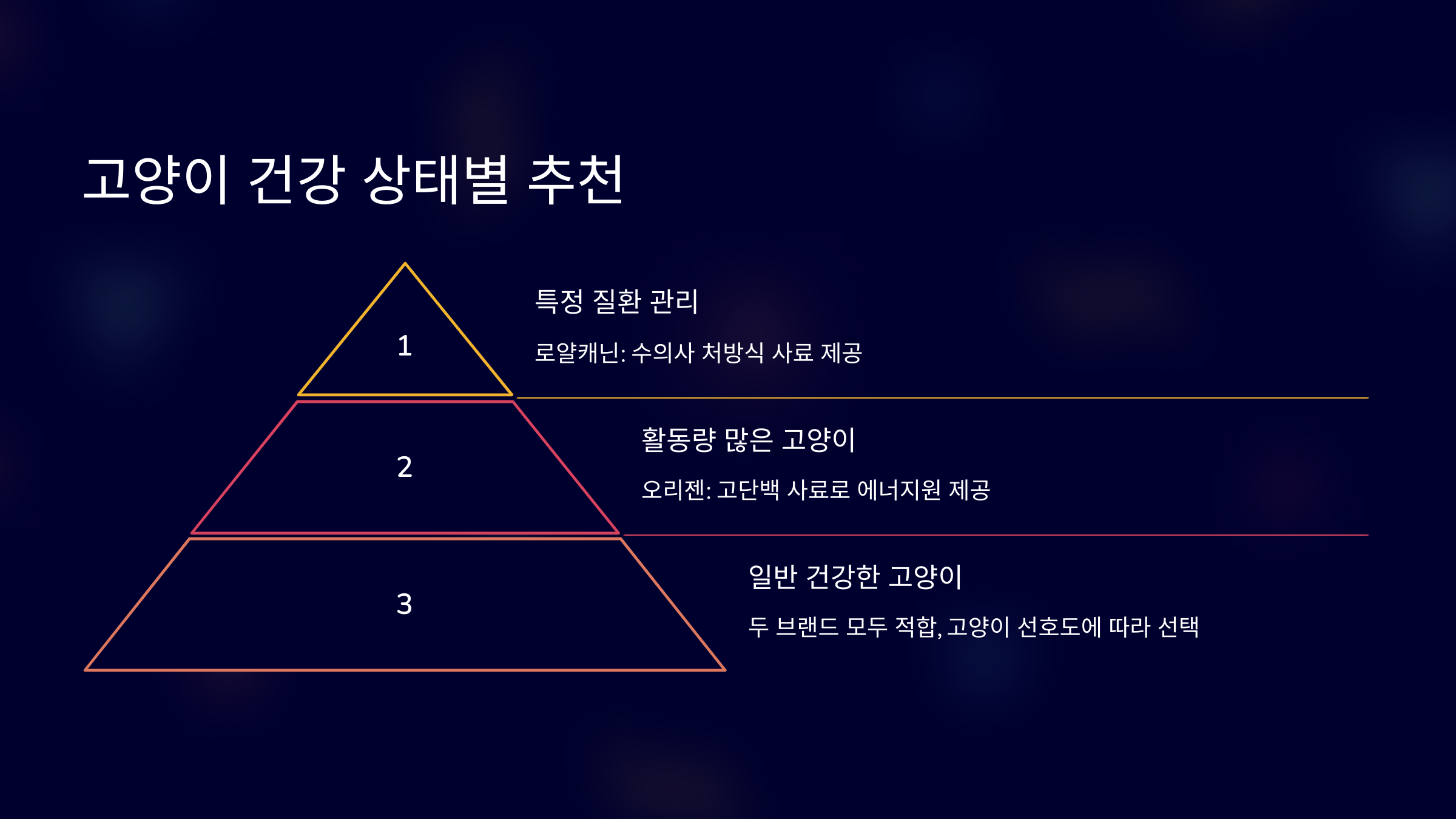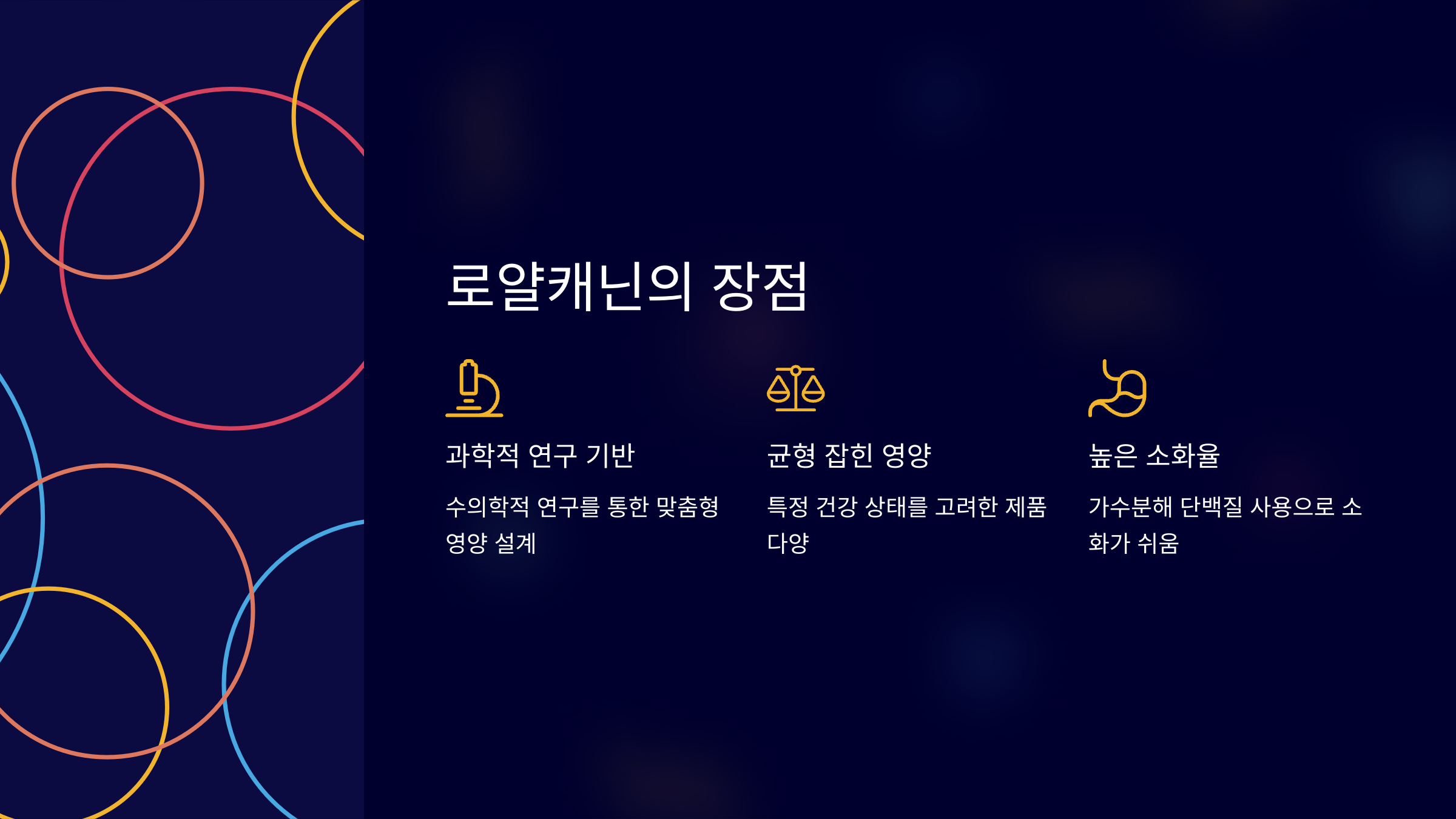 로얄캐닌은 **과학적 연구를 기반으로 맞춤형 영양 설계**를 제공하는 것이 강점이에요. 반면, 오리젠은 **자연식 개념**을 바탕으로 **고단백·고육류 함량**을 자랑하죠.