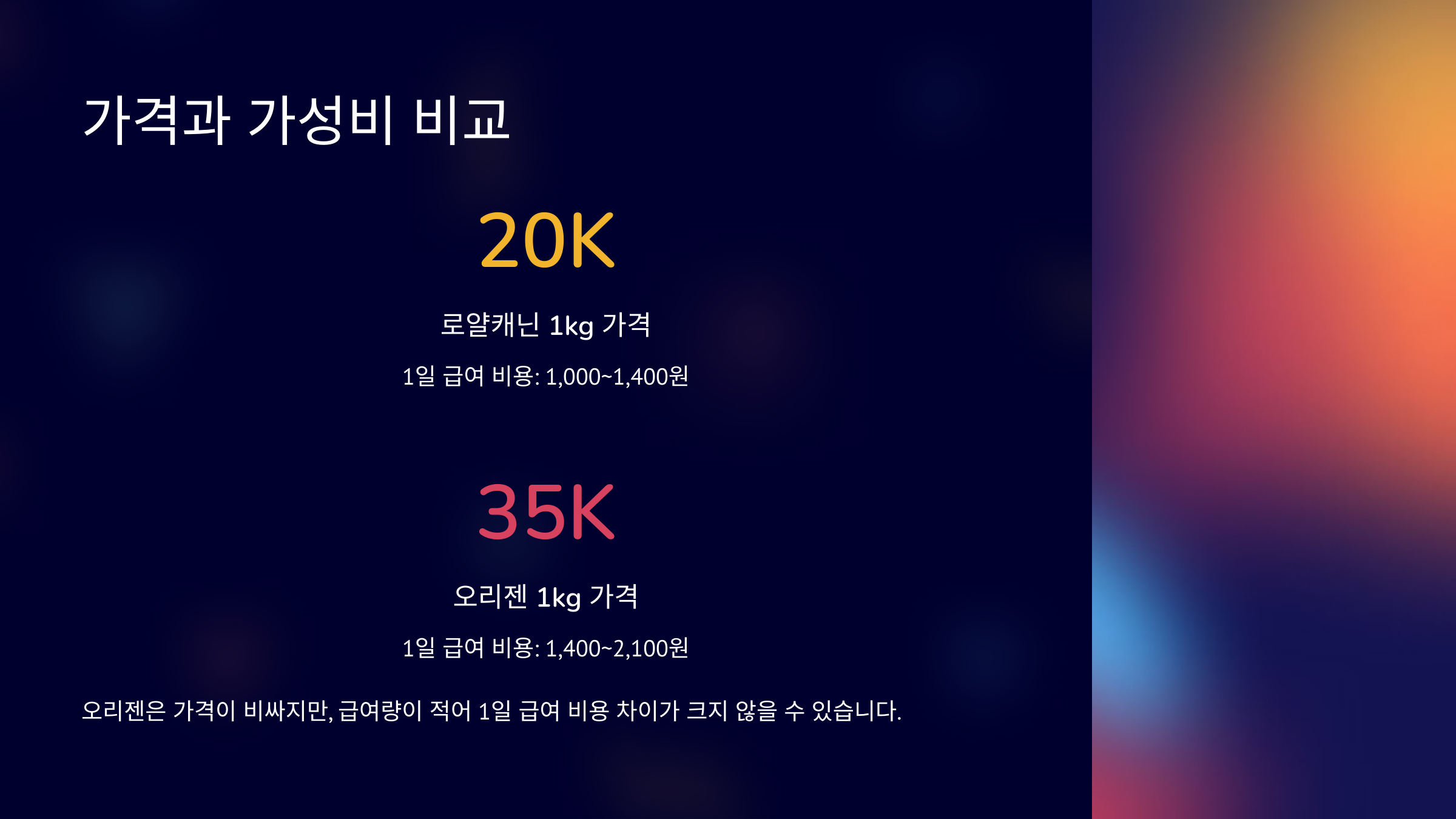 A5. **로얄캐닌은 1일 급여 비용이 저렴하고, 오리젠은 급여량이 적어도 충분한 영양을 제공**할 수 있어요. 장기적인 관점에서 가성비를 따져보는 것이 좋아요.