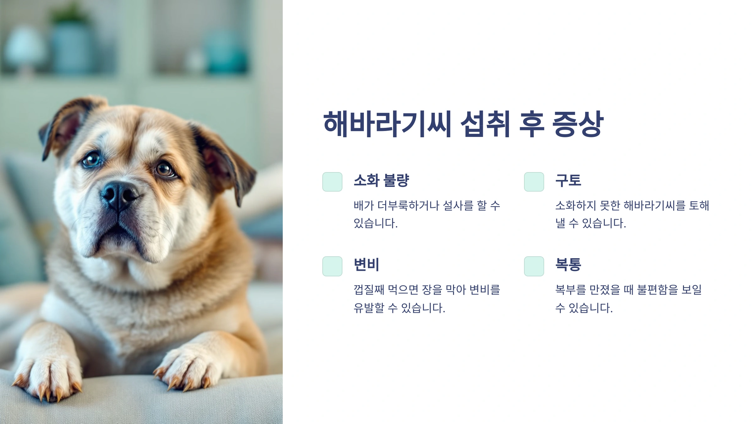 - 배탈 및 복통: 복부를 만졌을 때 불편함을 보일 수 있어요.