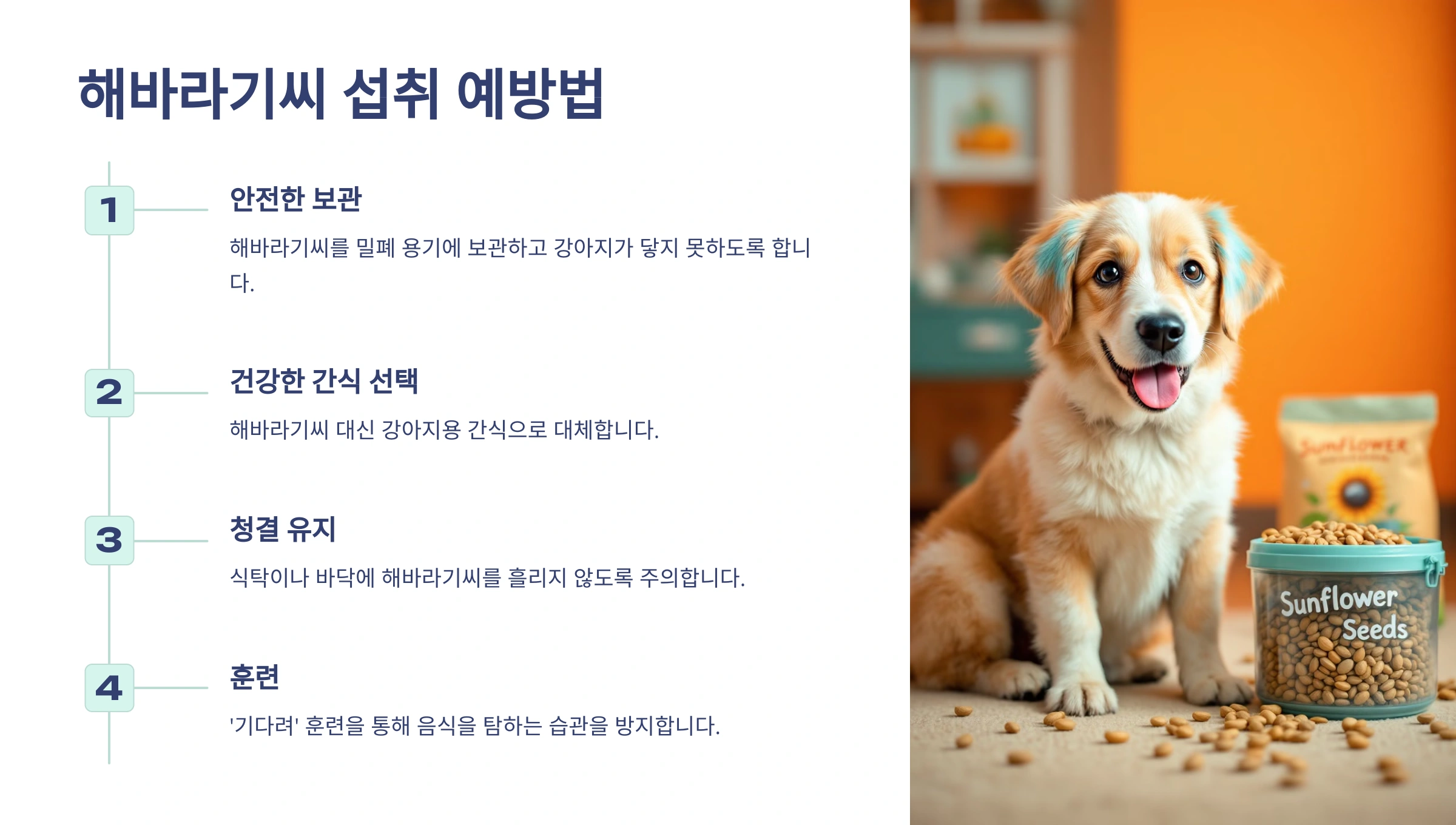 - 해바라기씨를 밀폐 용기에 보관하고 강아지가 닿지 못하도록 하기