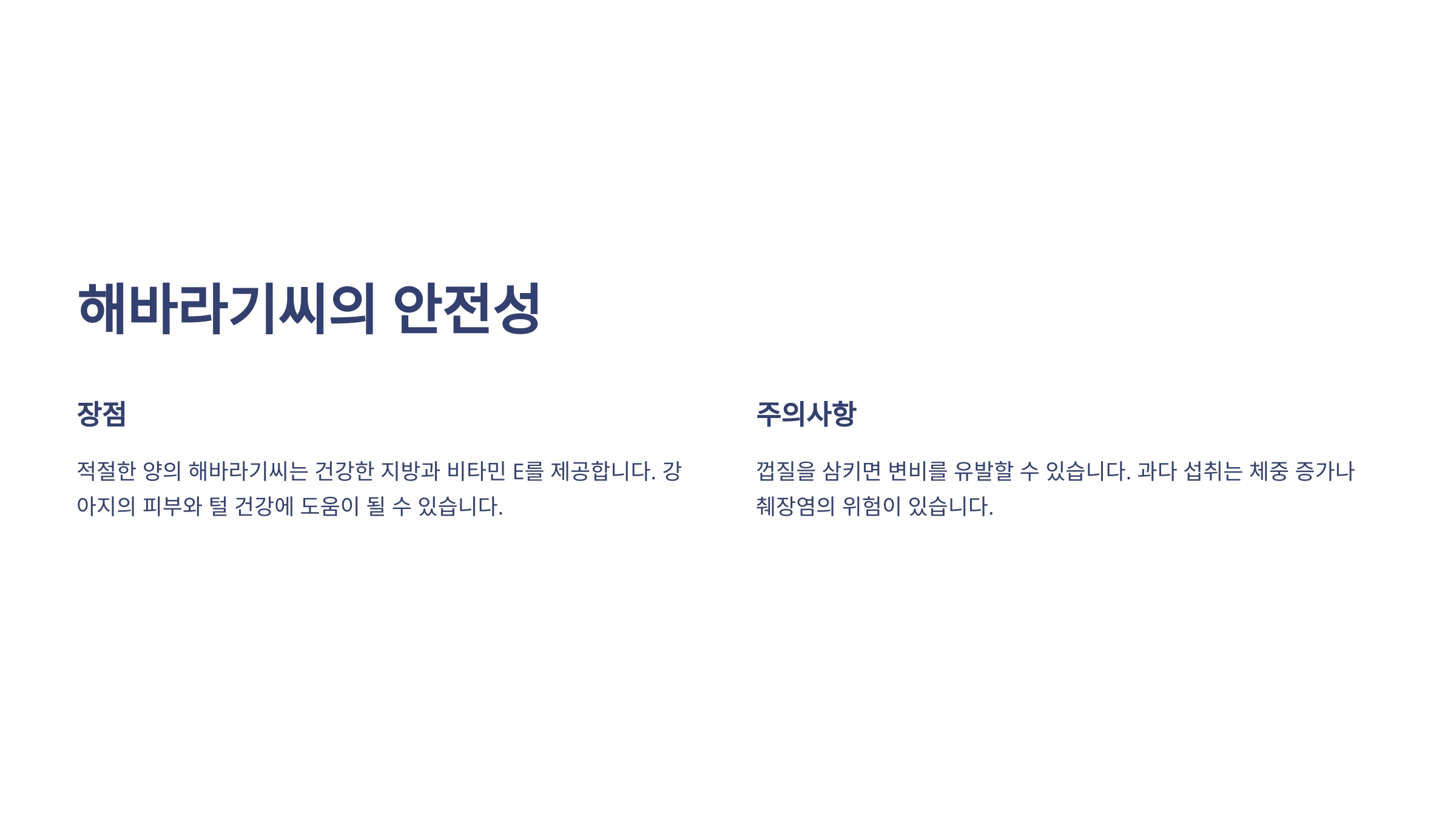 해바라기씨는 적절한 양이라면 강아지에게 해롭지 않아요. 오히려 건강한 지방과 비타민 E가 포함되어 있어 강아지 피부와 털 건강에 도움이 될 수도 있어요. 하지만 문제가 되는 건 바로 해바라기씨의 "껍질"과 "과다 섭취"랍니다.