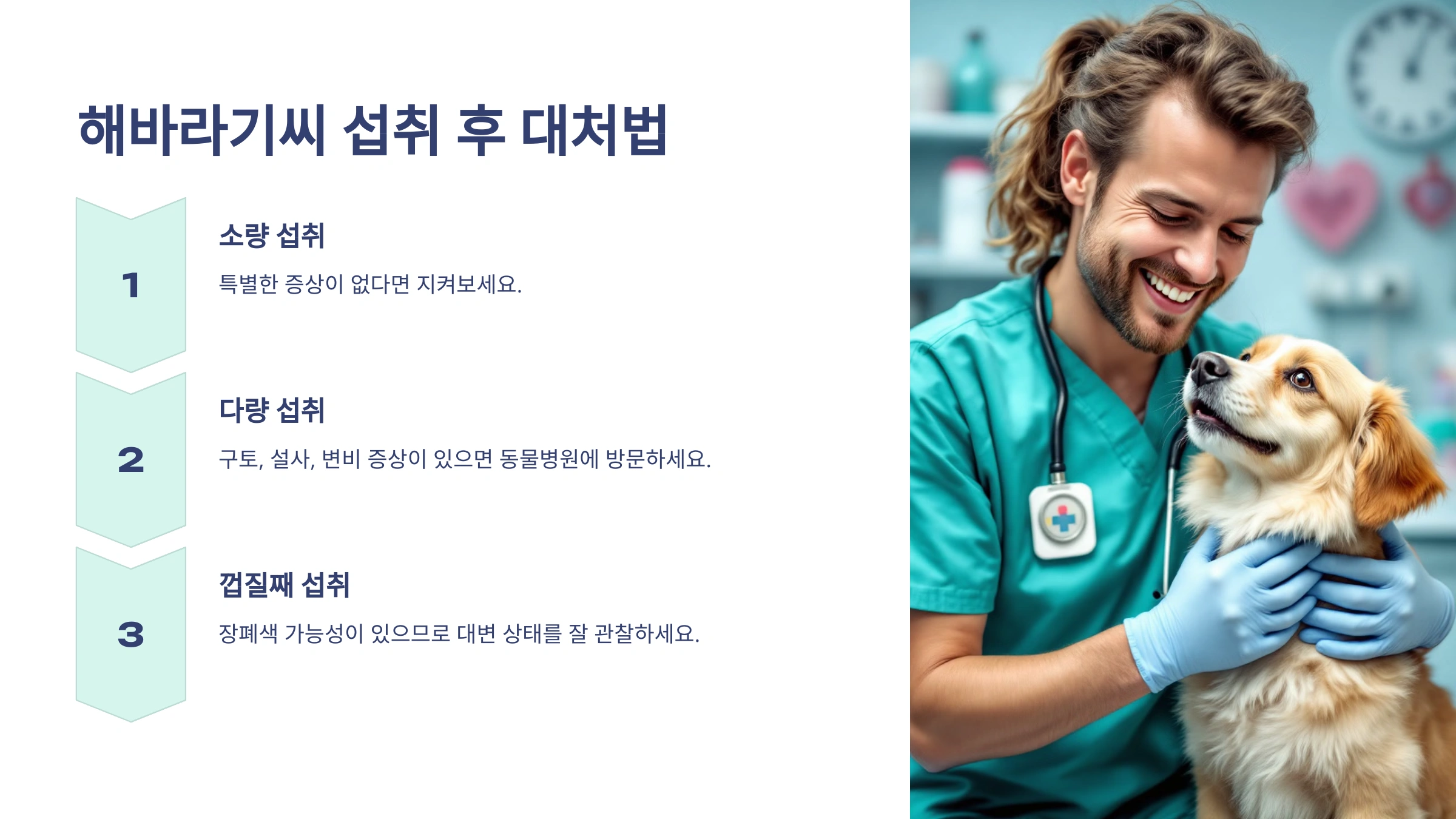 - 다량 섭취: 구토, 설사, 변비 증상이 있으면 동물병원에 방문하세요.