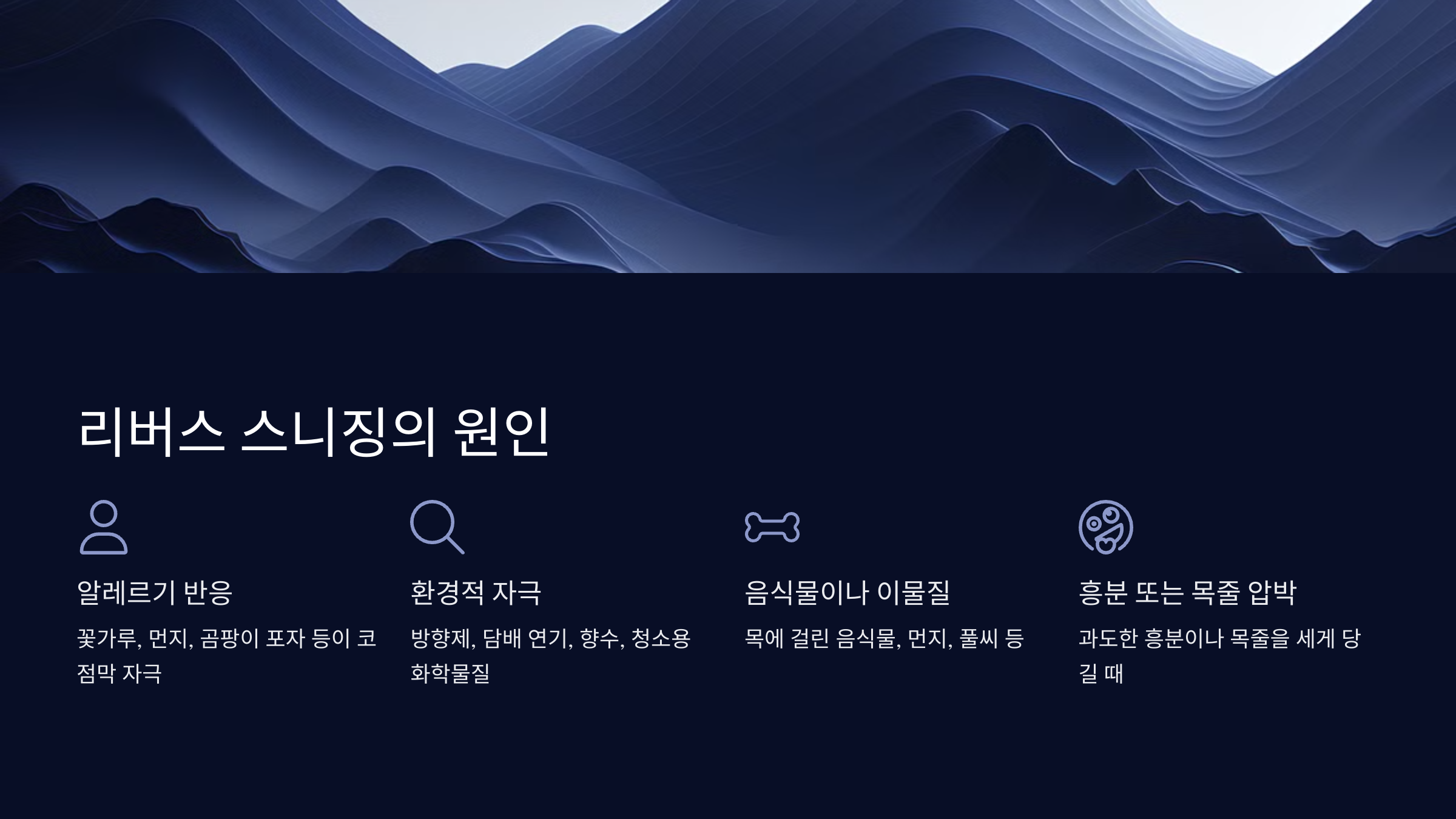 먹거나 핥은 음식물이 목에 걸리거나, 작은 먼지나 풀씨 같은 이물질이 기도를 자극할 때도 리버스 스니징이 나타날 수 있어요.